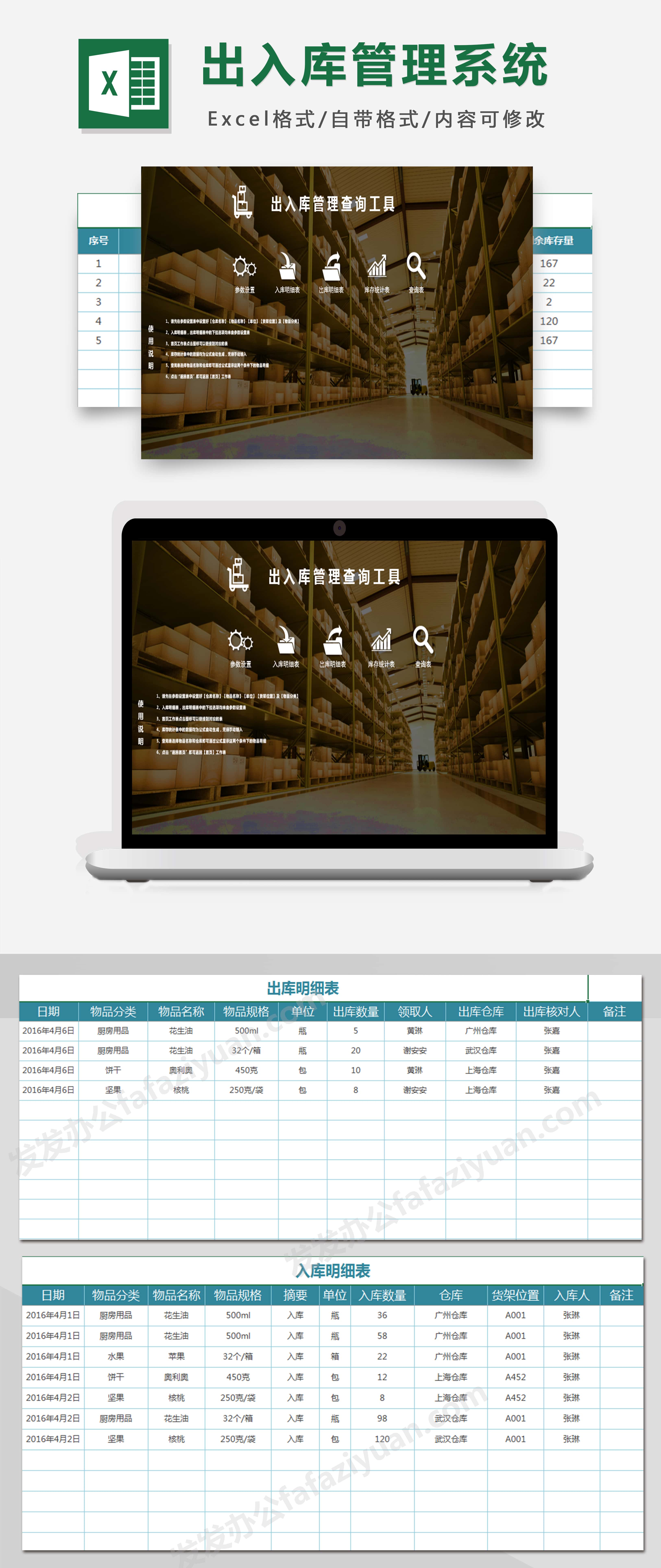 作品内容为出入库管理查询工具EXCEL模板管理系统, 格式为 xlsx, 大小8.5MB,包含多页表格,下载后可直接使用, 请使用软件Excel打开, 作品中主体文字及图片可替换修改,文字修改可直接点击文本框进行编辑,图片更改可选中图片后单击鼠标右键选择更换图片,也可根据自身需求增加和删除作品中的内容, 源文件无水印, 欢迎使用发发资源库。