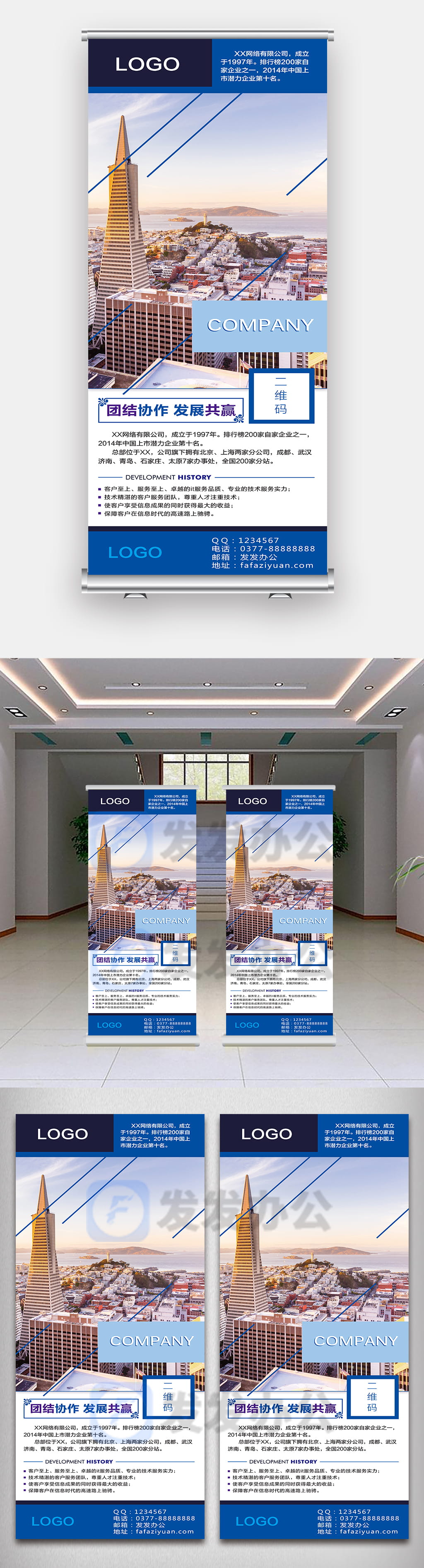 本作品内容为企业宣传/公司介绍商务x展架促销活动易拉宝PSD广告素材模板, 格式为 psd, 大小97 MB, 像素为3543 x 9449,分辨率为150dpi,请使用软件PhotoShop打开,作品中文字及图片可替换修改, 源文件无水印, 欢迎使用发发资源库。 资源下载此资源下载价格为8.8F币,VIP免费,请先登录
