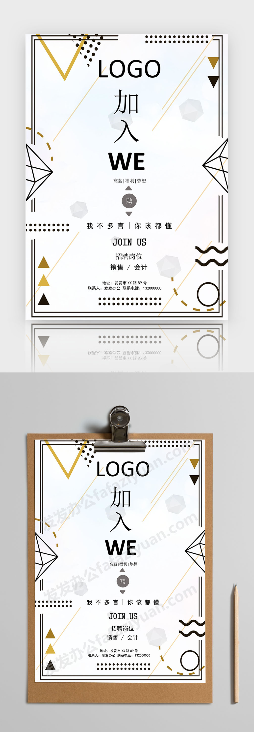 本作品内容为淡雅几何校园招聘海报Word海报模板, 格式为 docx, 大小1 MB, 页数为1, 请使用软件Word打开, 作品中主体文字及图片可替换修改,文字修改可直接点击文本框进行编辑,图片更改可选中图片后单击鼠标右键选择更换图片,也可根据自身需求增加和删除作品中的内容, 源文件无水印, 欢迎使用发发资源库。 资源下载此资源下载价格为8.8F币,VIP免费,请先登录