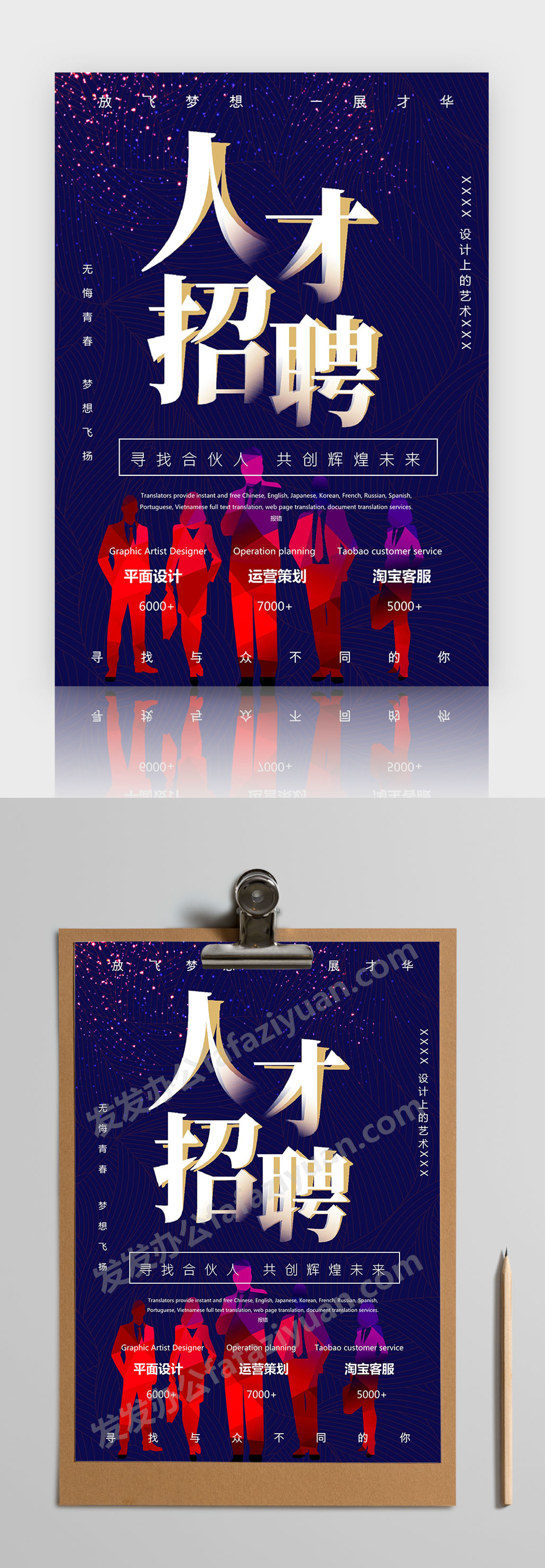 本作品内容为蓝色商务风招聘海报Word海报模板, 格式为 docx, 大小1 MB, 页数为1, 请使用软件Word打开, 作品中主体文字及图片可替换修改,文字修改可直接点击文本框进行编辑,图片更改可选中图片后单击鼠标右键选择更换图片,也可根据自身需求增加和删除作品中的内容, 源文件无水印, 欢迎使用发发资源库。 资源下载此资源下载价格为8.8F币,VIP免费,请先登录