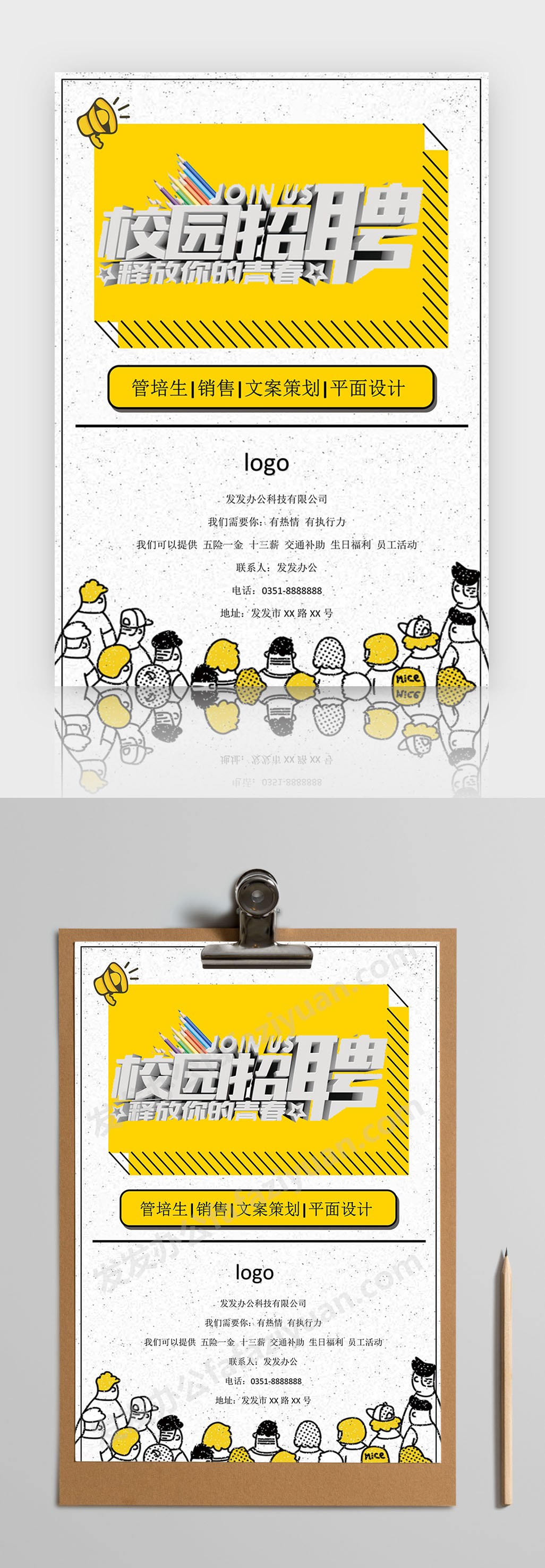 本作品内容为黄色卡通风校园招聘海报Word海报模板, 格式为 docx, 大小1 MB, 页数为1, 请使用软件Word打开, 作品中主体文字及图片可替换修改,文字修改可直接点击文本框进行编辑,图片更改可选中图片后单击鼠标右键选择更换图片,也可根据自身需求增加和删除作品中的内容, 源文件无水印, 欢迎使用发发资源库。