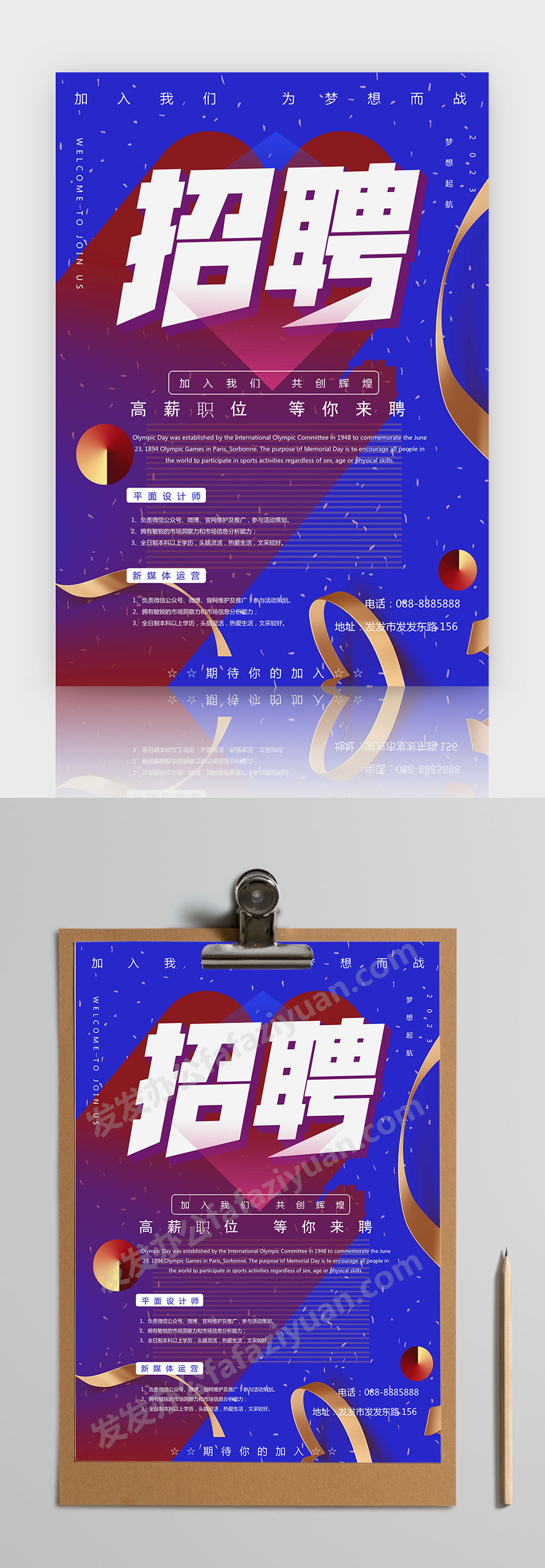 本作品内容为大气通用立体招聘海报Word海报模板, 格式为 docx, 大小1 MB, 页数为1, 请使用软件Word打开, 作品中主体文字及图片可替换修改,文字修改可直接点击文本框进行编辑,图片更改可选中图片后单击鼠标右键选择更换图片,也可根据自身需求增加和删除作品中的内容, 源文件无水印, 欢迎使用发发资源库。 资源下载此资源下载价格为8.8F币,VIP免费,请先登录