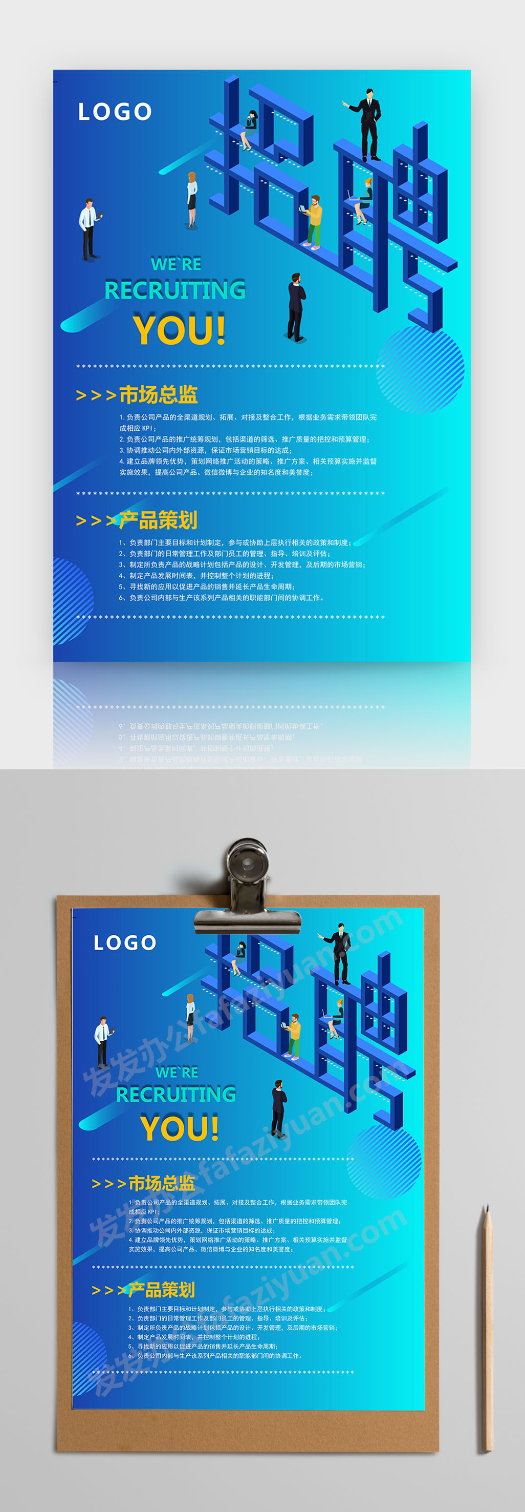 本作品内容为蓝色商务通用招聘海报Word海报模板, 格式为 docx, 大小1 MB, 页数为1, 请使用软件Word打开, 作品中主体文字及图片可替换修改,文字修改可直接点击文本框进行编辑,图片更改可选中图片后单击鼠标右键选择更换图片,也可根据自身需求增加和删除作品中的内容, 源文件无水印, 欢迎使用发发资源库。 资源下载此资源下载价格为8.8F币,VIP免费,请先登录
