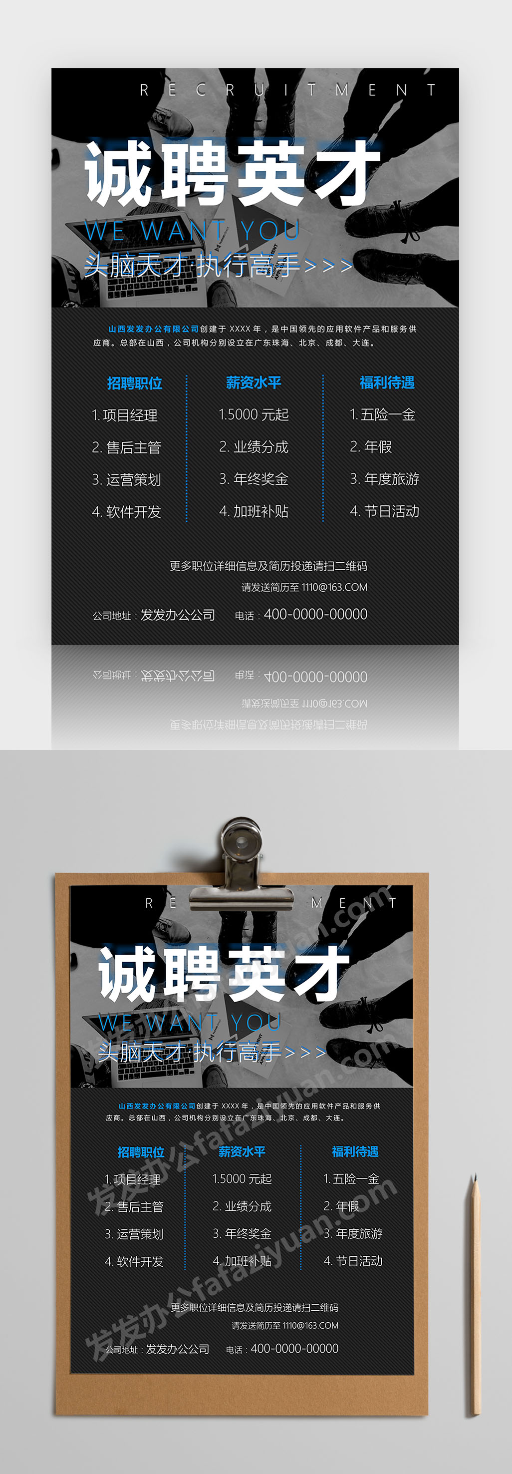本作品内容为诚聘英才招聘海报Word海报模板, 格式为 docx, 大小1 MB, 页数为1, 请使用软件Word打开, 作品中主体文字及图片可替换修改,文字修改可直接点击文本框进行编辑,图片更改可选中图片后单击鼠标右键选择更换图片,也可根据自身需求增加和删除作品中的内容, 源文件无水印, 欢迎使用发发资源库。 资源下载此资源下载价格为8.8F币,VIP免费,请先登录