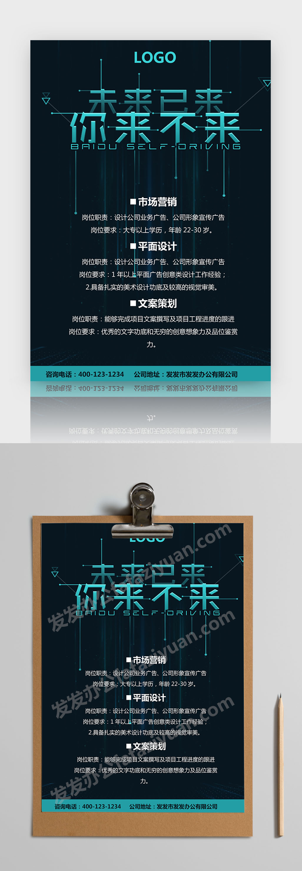 本作品内容为未来已来你来不来蓝色招聘海报Word海报模板, 格式为 docx, 大小4 MB, 页数为1, 请使用软件Word打开, 作品中主体文字及图片可替换修改,文字修改可直接点击文本框进行编辑,图片更改可选中图片后单击鼠标右键选择更换图片,也可根据自身需求增加和删除作品中的内容, 源文件无水印, 欢迎使用发发资源库。 资源下载此资源下载价格为8.8F币,VIP免费,请先登录