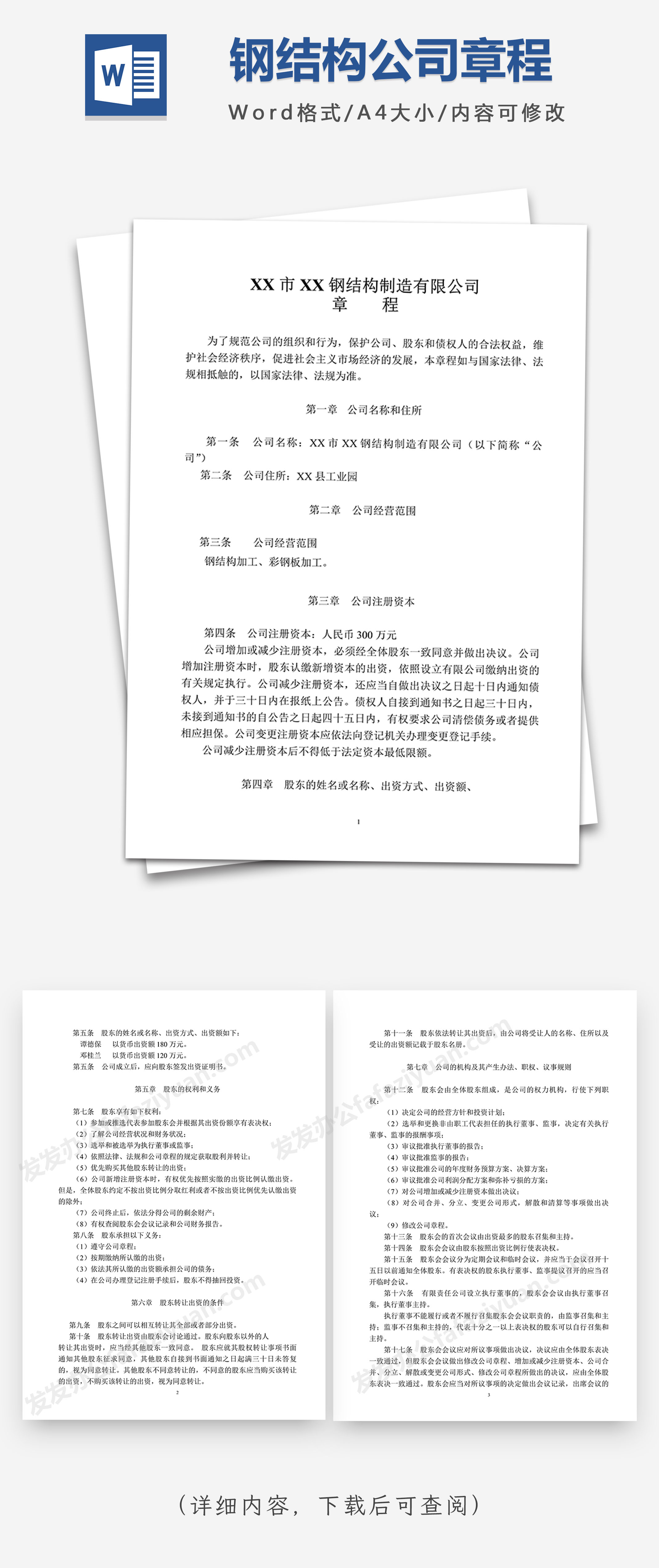 本作品内容为钢结构公司章程Word模板, 格式为 docx, 大小1MB, 页数为7, 请使用软件Word打开, 作品中主体文字及图片可替换修改,文字修改可直接点击文本框进行编辑,图片更改可选中图片后单击鼠标右键选择更换图片,也可根据自身需求增加和删除作品中的内容, 源文件无水印, 欢迎使用发发资源库。