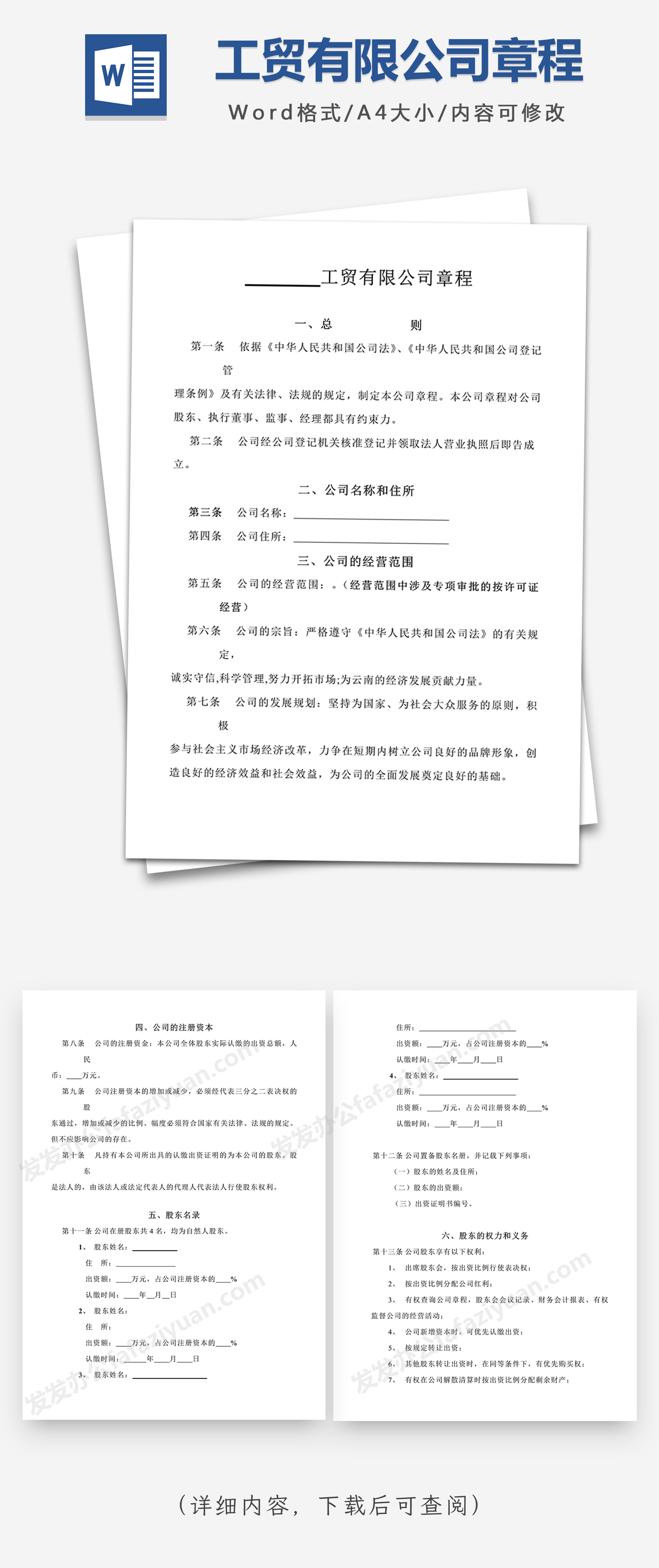 本作品内容为工贸有限公司章程Word模板, 格式为 docx, 大小1MB, 页数为15, 请使用软件Word打开, 作品中主体文字及图片可替换修改,文字修改可直接点击文本框进行编辑,图片更改可选中图片后单击鼠标右键选择更换图片,也可根据自身需求增加和删除作品中的内容, 源文件无水印, 欢迎使用发发资源库。