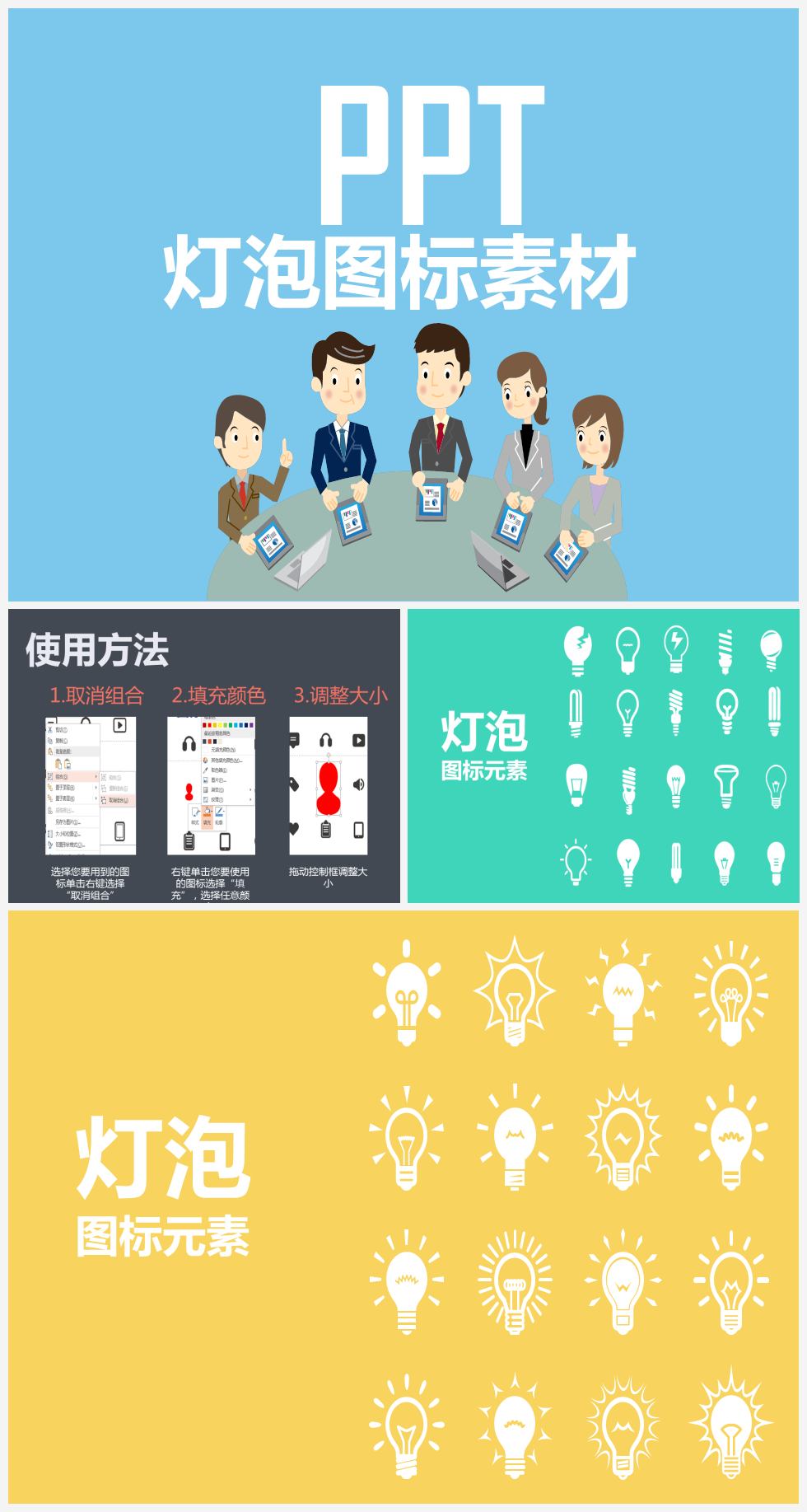 作品内容为灯泡图标元素PPT小图标PPT素材, 格式为 pptx,大小0.34MB, 页数为4,请使用软件PowerPoint打开,作品中PNG图片为免抠图片,源文件无水印,可以直接使用,欢迎使用发发资源库。