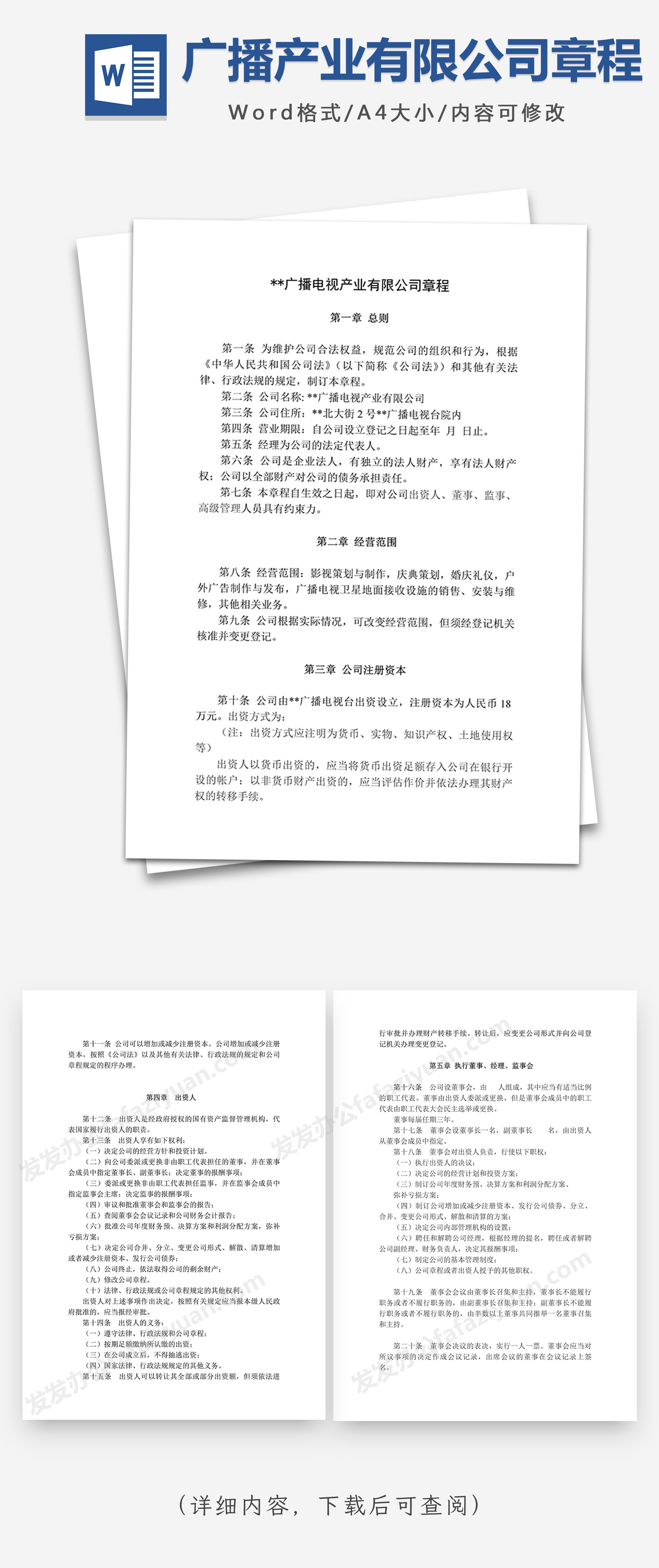 本作品内容为广播电视产业有限公司章程Word模板, 格式为 docx, 大小1MB, 页数为6, 请使用软件Word打开, 作品中主体文字及图片可替换修改,文字修改可直接点击文本框进行编辑,图片更改可选中图片后单击鼠标右键选择更换图片,也可根据自身需求增加和删除作品中的内容, 源文件无水印, 欢迎使用发发资源库。