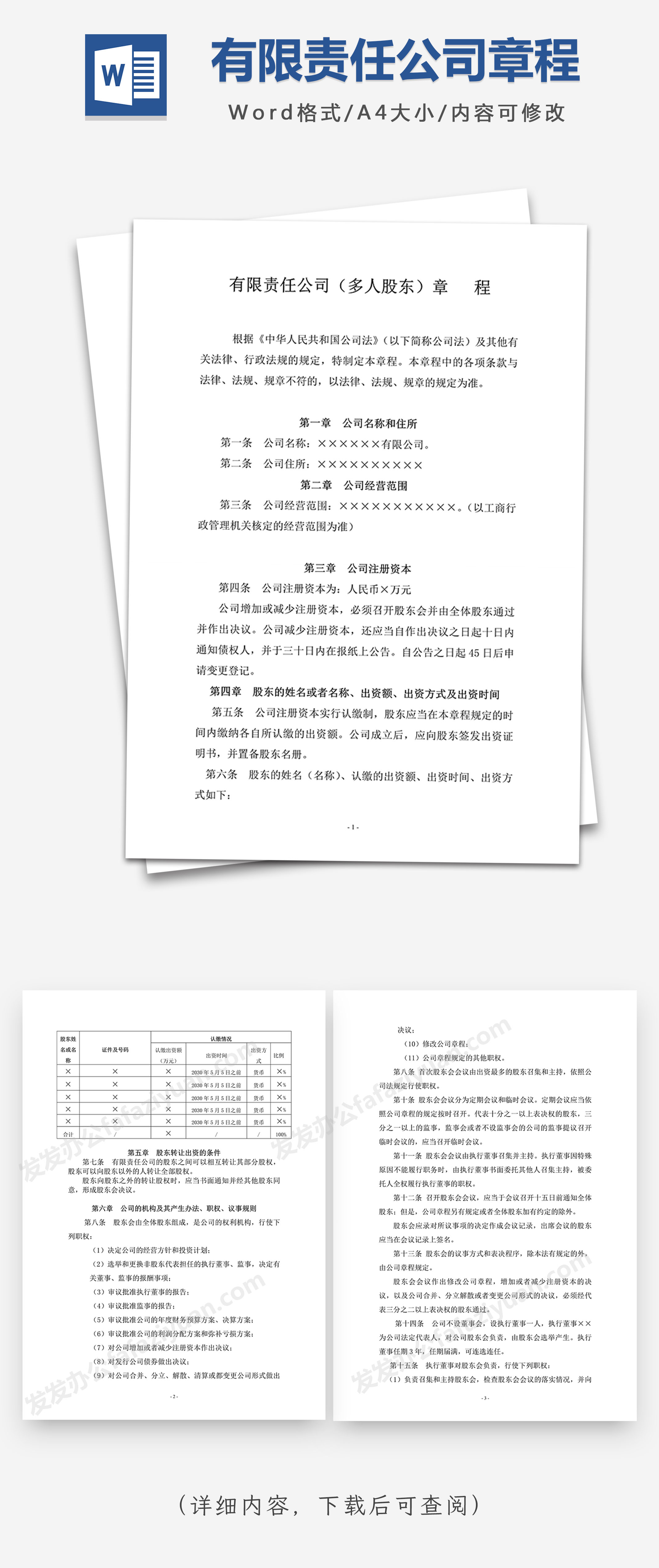 本作品内容为有限责任公司章程(多人股东)Word模板, 格式为 docx, 大小1MB, 页数为7, 请使用软件Word打开, 作品中主体文字及图片可替换修改,文字修改可直接点击文本框进行编辑,图片更改可选中图片后单击鼠标右键选择更换图片,也可根据自身需求增加和删除作品中的内容, 源文件无水印, 欢迎使用发发资源库。