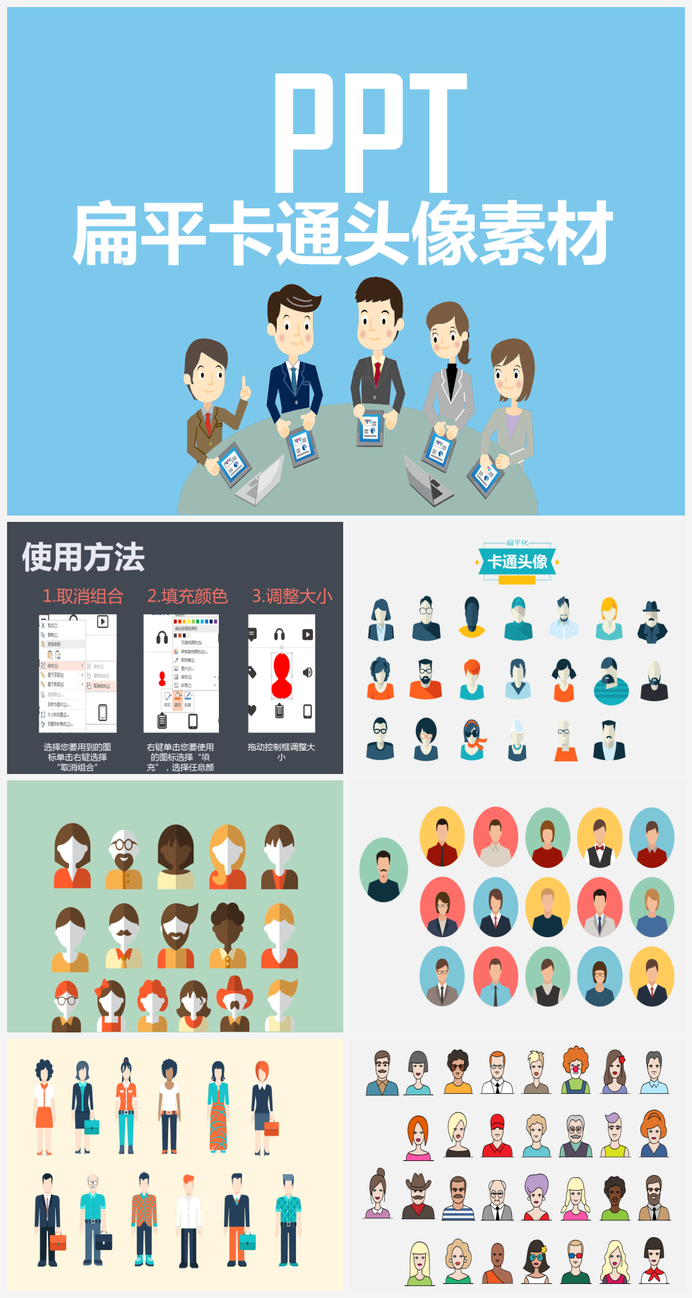 作品内容为扁平卡通头像图标元素PPT小图标PPT素材, 格式为 pptx,大小0.85MB, 页数为7,请使用软件PowerPoint打开,作品中PNG图片为免抠图片,源文件无水印,可以直接使用,欢迎使用发发资源库。