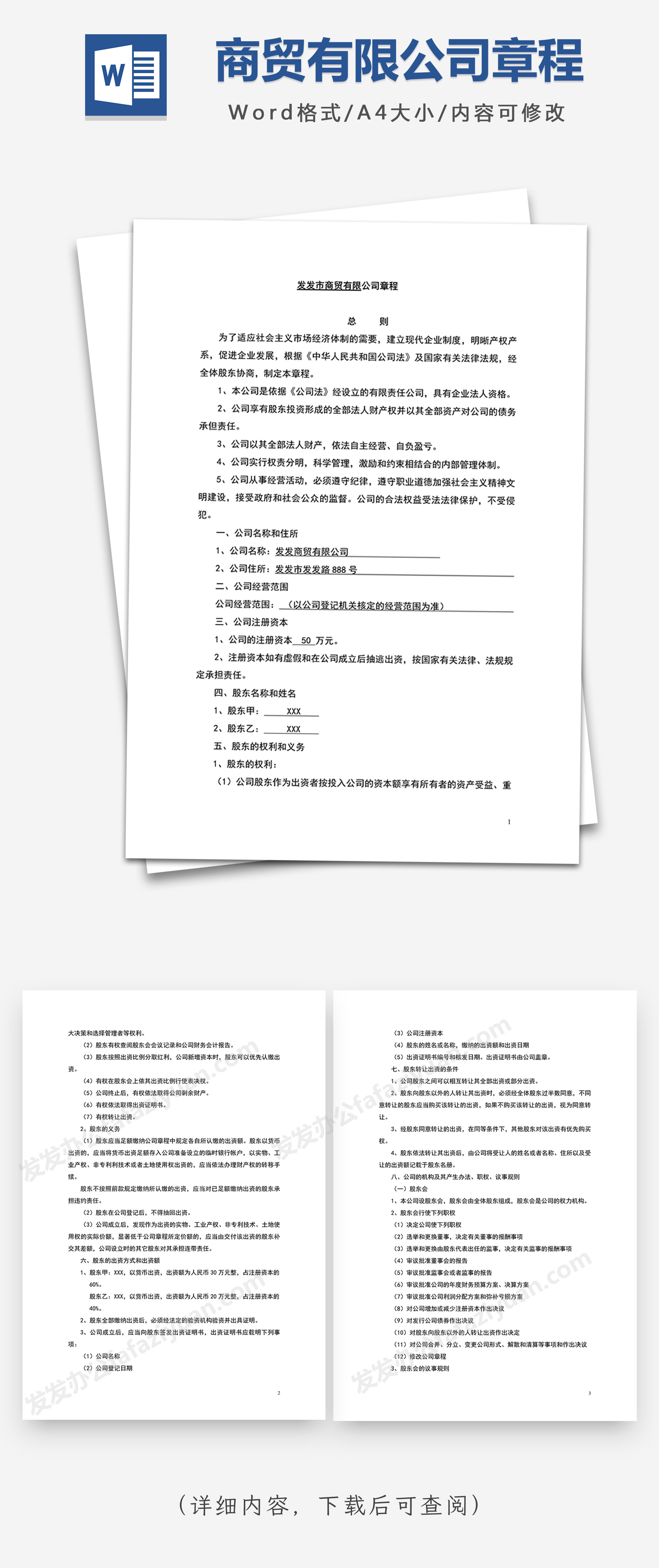 本作品内容为商贸有限公司章程范本Word模板, 格式为 docx, 大小1MB, 页数为9, 请使用软件Word打开, 作品中主体文字及图片可替换修改,文字修改可直接点击文本框进行编辑,图片更改可选中图片后单击鼠标右键选择更换图片,也可根据自身需求增加和删除作品中的内容, 源文件无水印, 欢迎使用发发资源库。