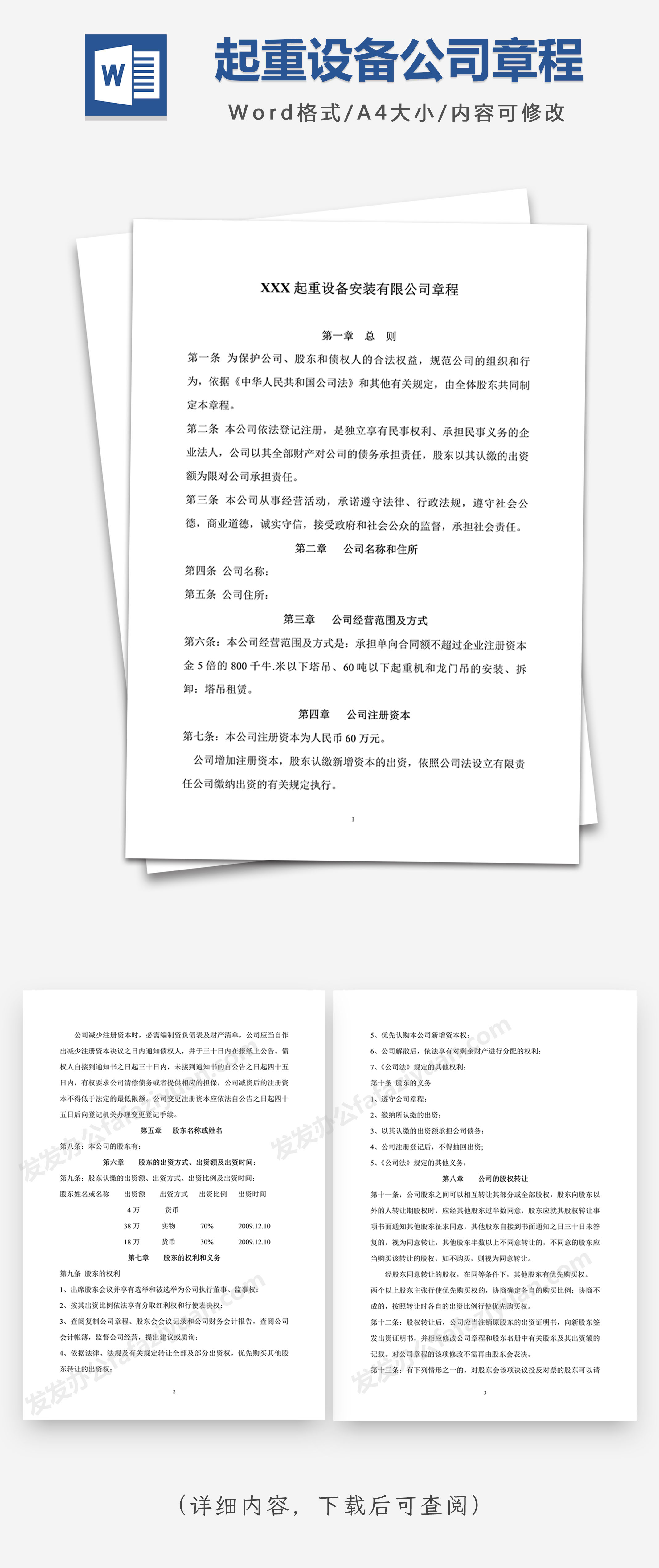 本作品内容为起重设备安装有限公司章程Word模板, 格式为 docx, 大小1MB, 页数为11, 请使用软件Word打开, 作品中主体文字及图片可替换修改,文字修改可直接点击文本框进行编辑,图片更改可选中图片后单击鼠标右键选择更换图片,也可根据自身需求增加和删除作品中的内容, 源文件无水印, 欢迎使用发发资源库。 资源下载此资源下载价格为8.8F币,VIP免费,请先登录