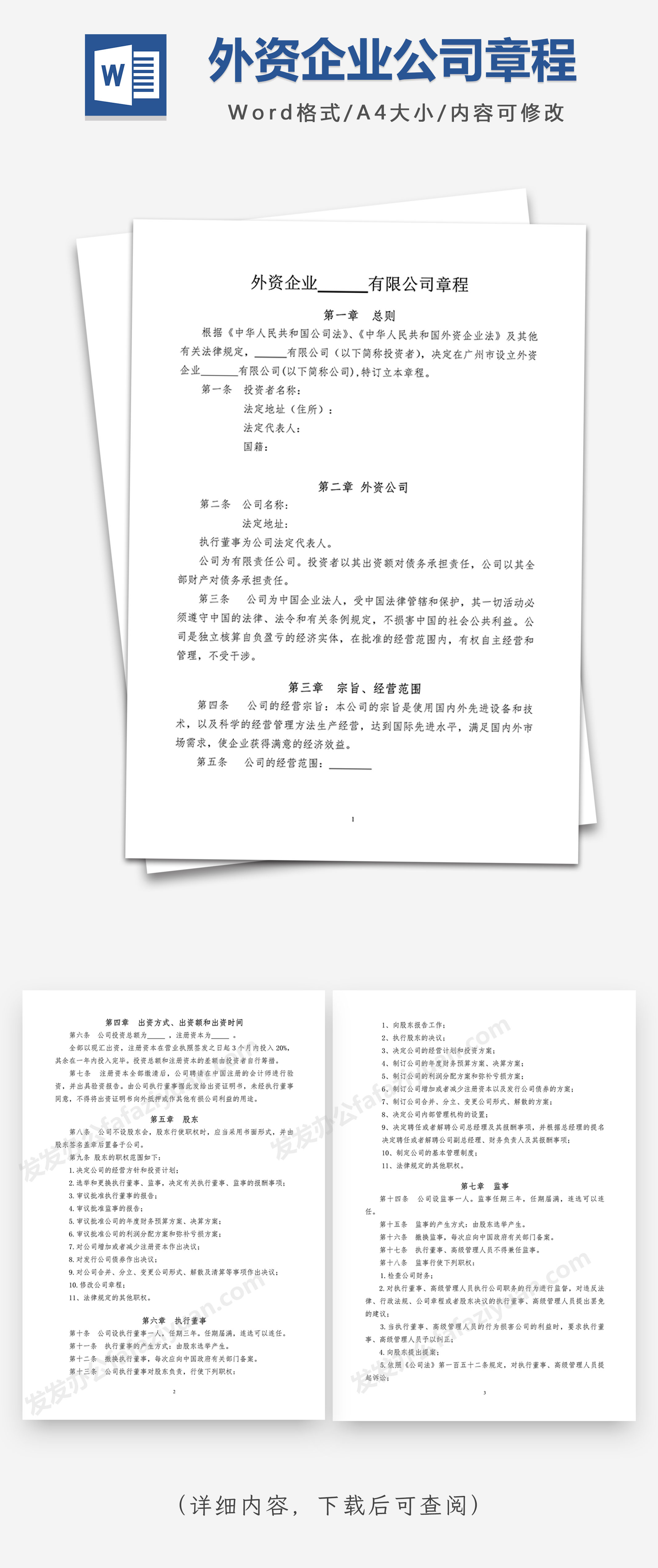 本作品内容为外资企业有限公司章程范本(一人有限执行董事监事), 格式为 docx, 大小1MB, 页数为8, 请使用软件Word打开, 作品中主体文字及图片可替换修改,文字修改可直接点击文本框进行编辑,图片更改可选中图片后单击鼠标右键选择更换图片,也可根据自身需求增加和删除作品中的内容, 源文件无水印, 欢迎使用发发资源库。