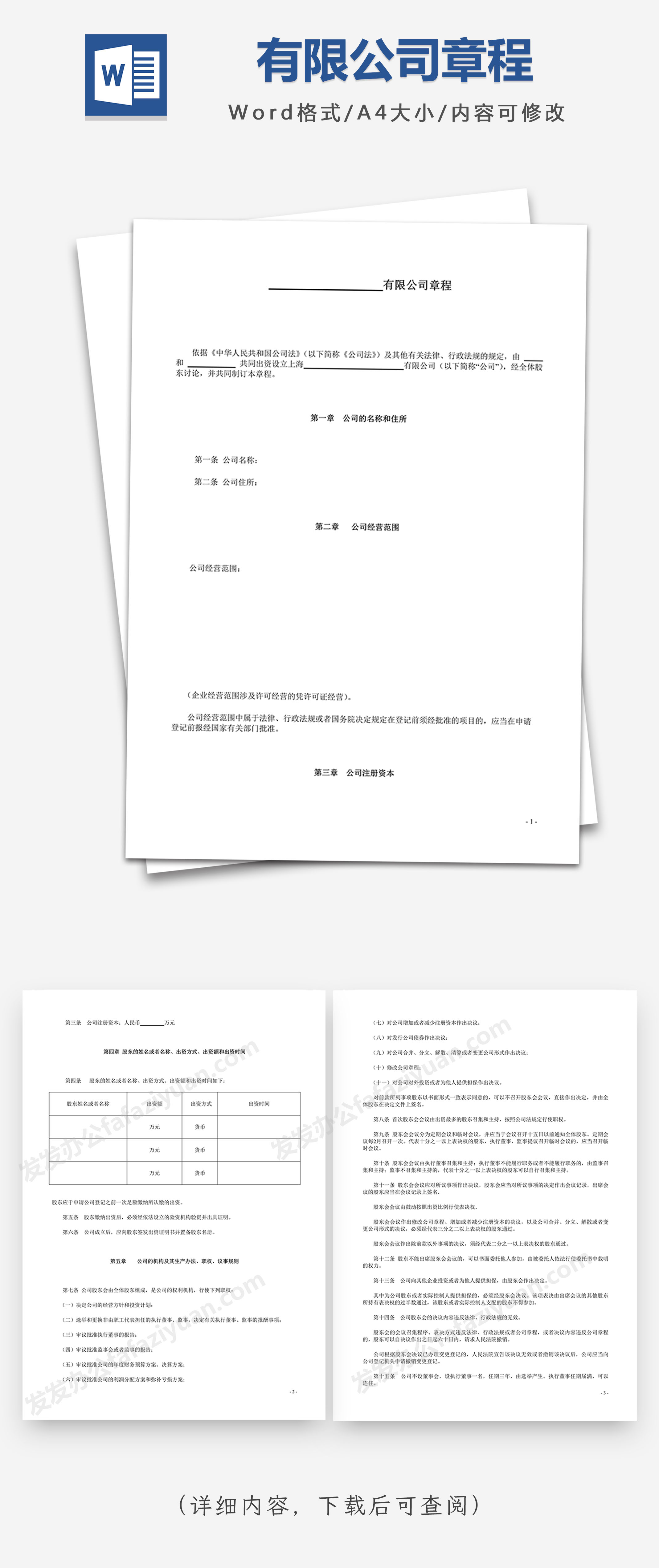 本作品内容为有限公司章程完整范本Word模板, 格式为 docx, 大小1MB, 页数为8, 请使用软件Word打开, 作品中主体文字及图片可替换修改,文字修改可直接点击文本框进行编辑,图片更改可选中图片后单击鼠标右键选择更换图片,也可根据自身需求增加和删除作品中的内容, 源文件无水印, 欢迎使用发发资源库。