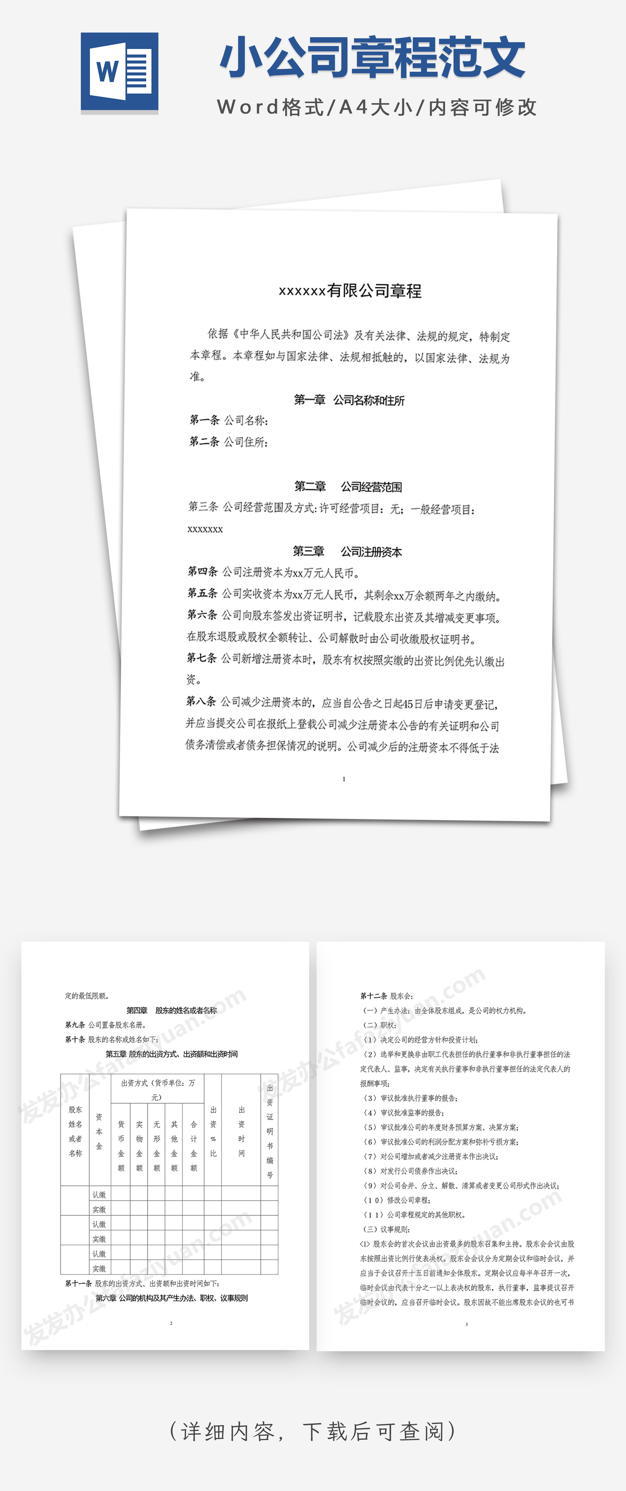 本作品内容为小公司章程范文Word模板, 格式为 docx, 大小1MB, 页数为9, 请使用软件Word打开, 作品中主体文字及图片可替换修改,文字修改可直接点击文本框进行编辑,图片更改可选中图片后单击鼠标右键选择更换图片,也可根据自身需求增加和删除作品中的内容, 源文件无水印, 欢迎使用发发资源库。