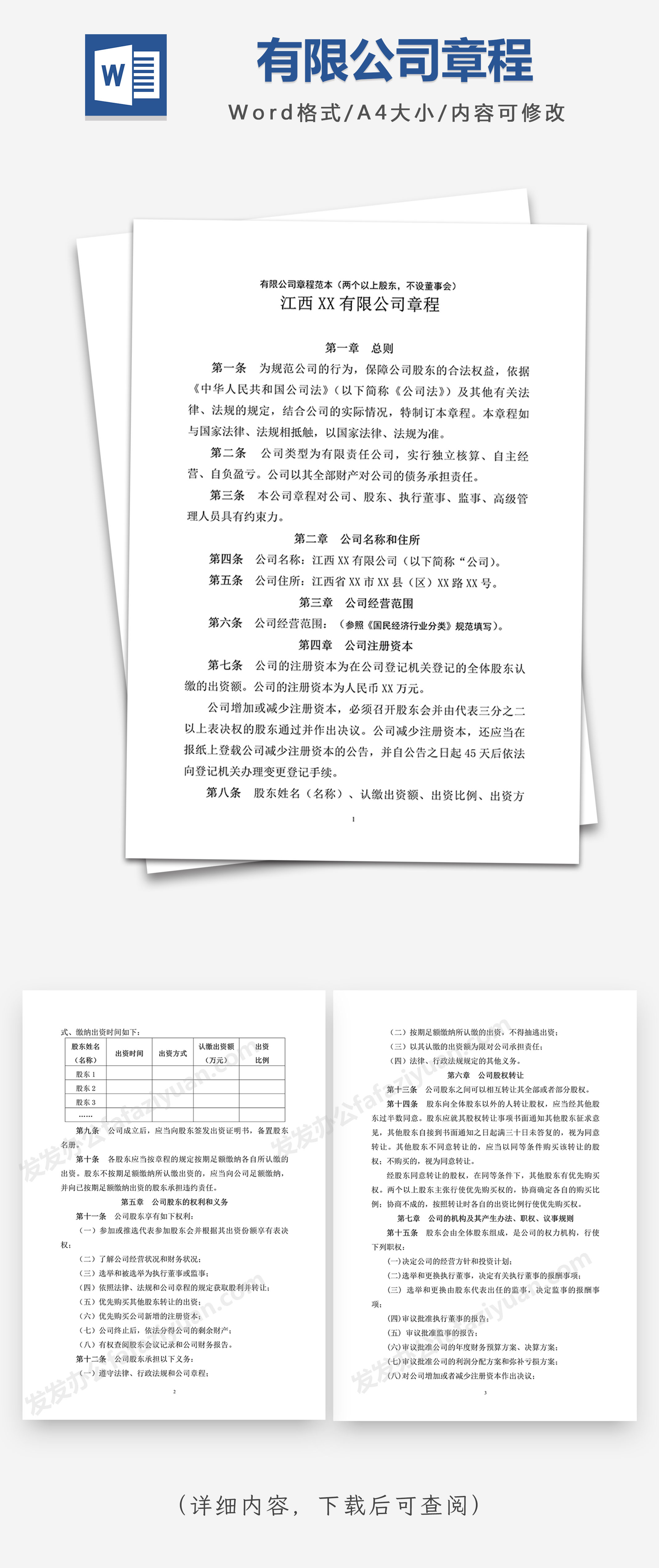 本作品内容为有限公司章程范本(两个以上股东,不设董事会)Word模板, 格式为 docx, 大小1MB, 页数为10, 请使用软件Word打开, 作品中主体文字及图片可替换修改,文字修改可直接点击文本框进行编辑,图片更改可选中图片后单击鼠标右键选择更换图片,也可根据自身需求增加和删除作品中的内容, 源文件无水印, 欢迎使用发发资源库。