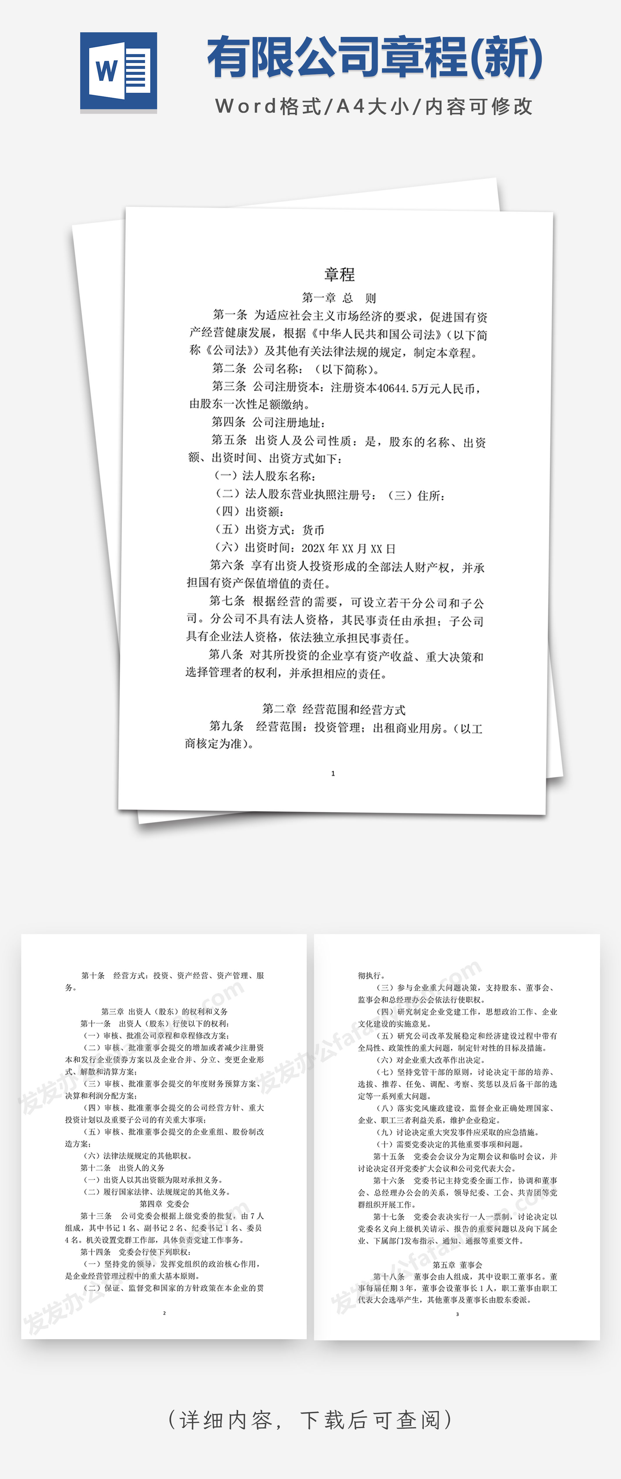 本作品内容为有限公司章程(新)Word模板, 格式为 docx, 大小1MB, 页数为11, 请使用软件Word打开, 作品中主体文字及图片可替换修改,文字修改可直接点击文本框进行编辑,图片更改可选中图片后单击鼠标右键选择更换图片,也可根据自身需求增加和删除作品中的内容, 源文件无水印, 欢迎使用发发资源库。