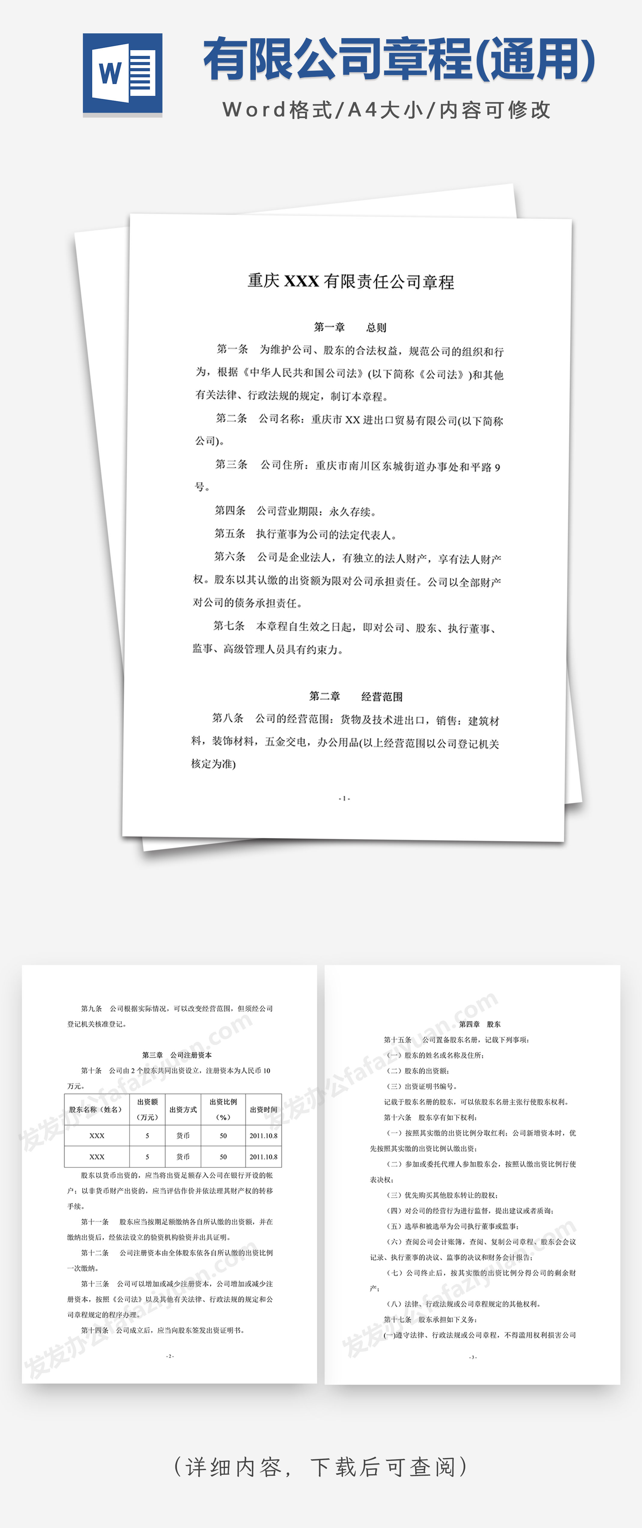 本作品内容为有限责任公司章程通用Word模板, 格式为 docx, 大小1MB, 页数为10, 请使用软件Word打开, 作品中主体文字及图片可替换修改,文字修改可直接点击文本框进行编辑,图片更改可选中图片后单击鼠标右键选择更换图片,也可根据自身需求增加和删除作品中的内容, 源文件无水印, 欢迎使用发发资源库。