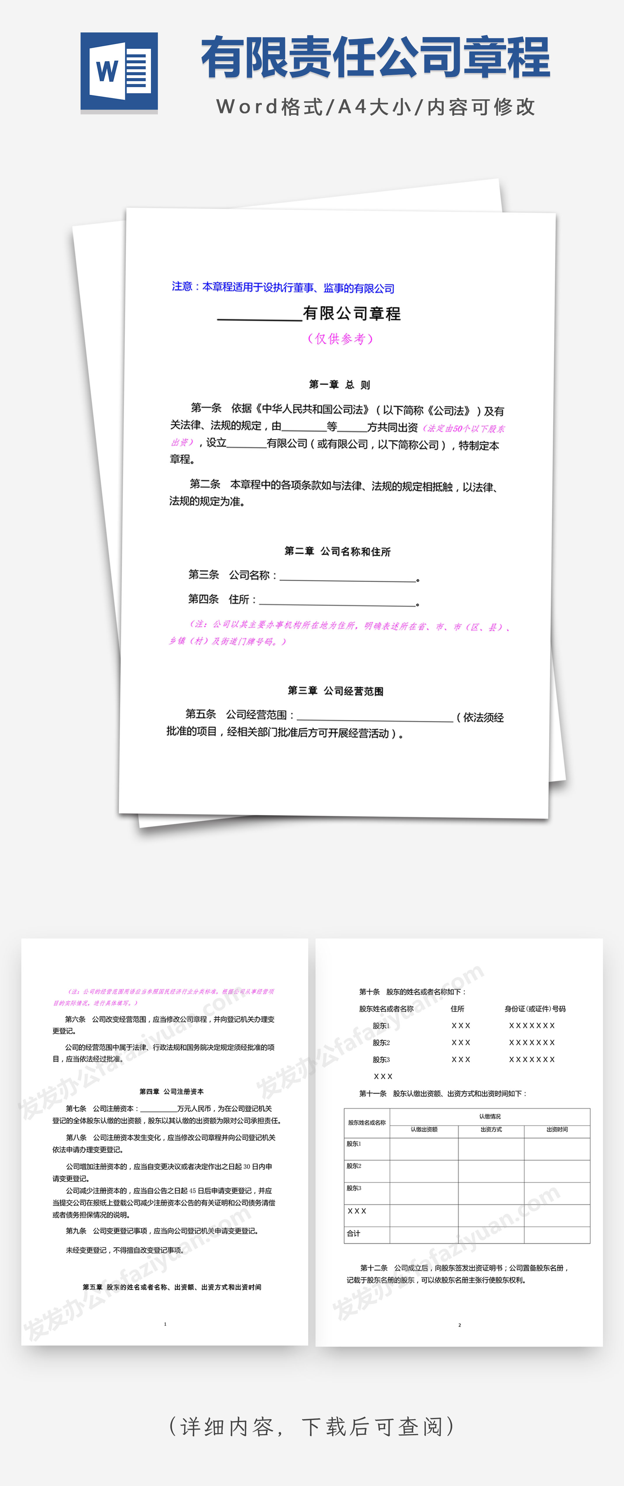 本作品内容为有限责任公司公司章程范本Word模板, 格式为 docx, 大小1MB, 页数为12, 请使用软件Word打开, 作品中主体文字及图片可替换修改,文字修改可直接点击文本框进行编辑,图片更改可选中图片后单击鼠标右键选择更换图片,也可根据自身需求增加和删除作品中的内容, 源文件无水印, 欢迎使用发发资源库。 资源下载此资源下载价格为8.8F币,VIP免费,请先登录