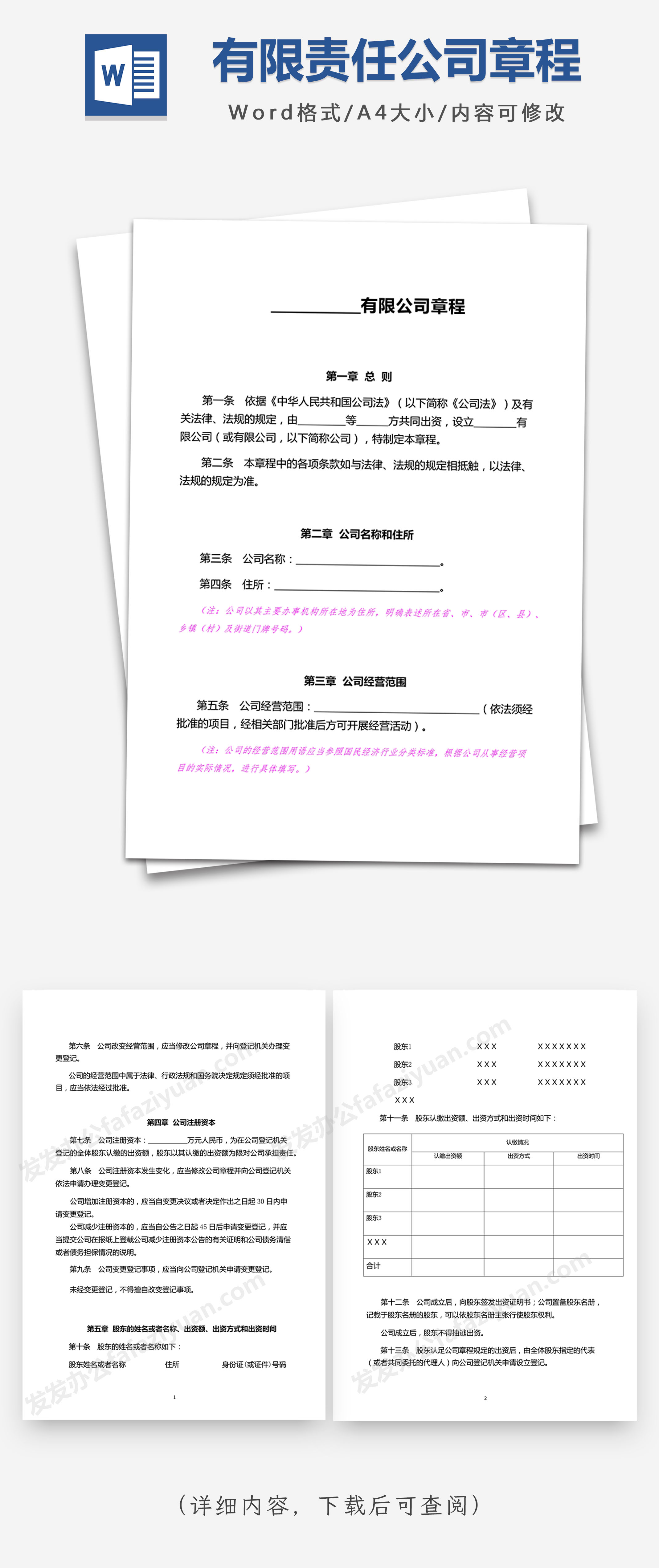 本作品内容为有限责任公司公司章程工商局范本Word模板, 格式为 docx, 大小1MB, 页数为12, 请使用软件Word打开, 作品中主体文字及图片可替换修改,文字修改可直接点击文本框进行编辑,图片更改可选中图片后单击鼠标右键选择更换图片,也可根据自身需求增加和删除作品中的内容, 源文件无水印, 欢迎使用发发资源库。