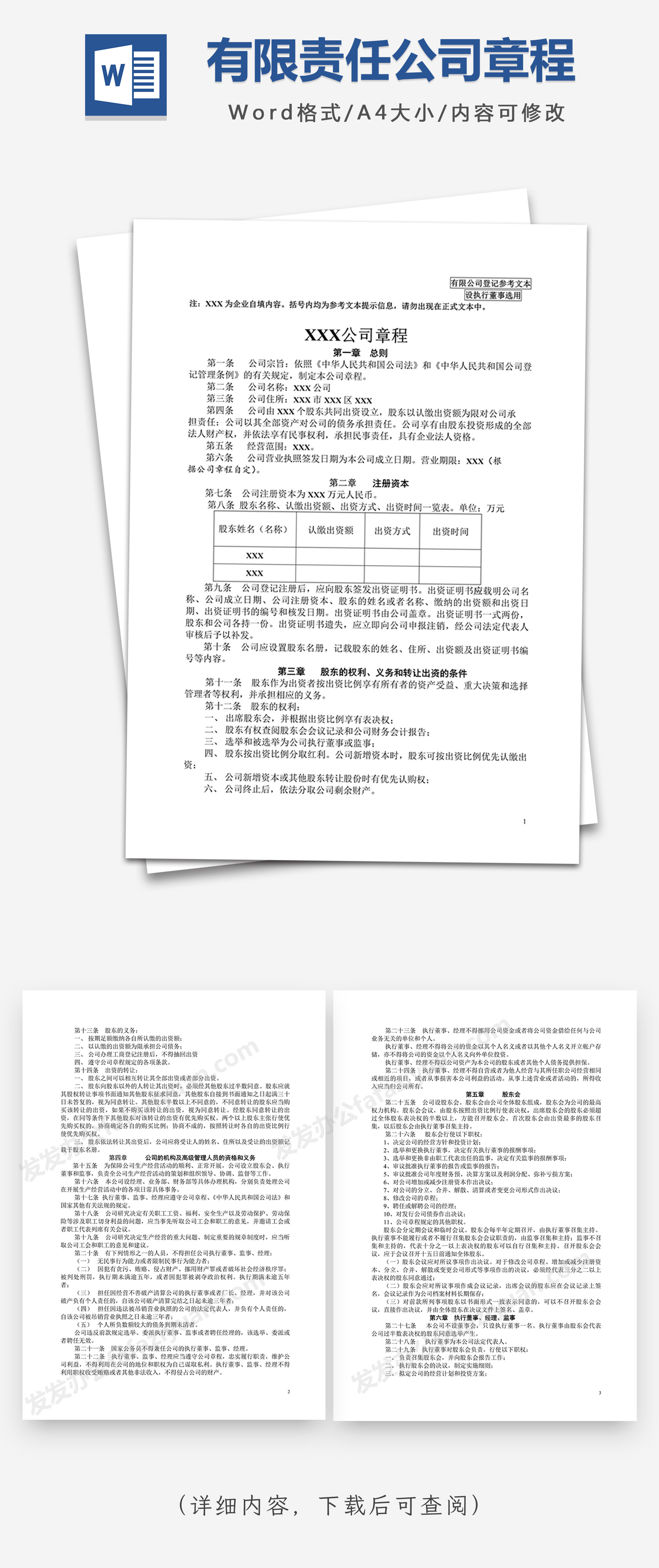 本作品内容为有限责任公司章程(设执行董事)Word模板, 格式为 docx, 大小1MB, 页数为6, 请使用软件Word打开, 作品中主体文字及图片可替换修改,文字修改可直接点击文本框进行编辑,图片更改可选中图片后单击鼠标右键选择更换图片,也可根据自身需求增加和删除作品中的内容, 源文件无水印, 欢迎使用发发资源库。