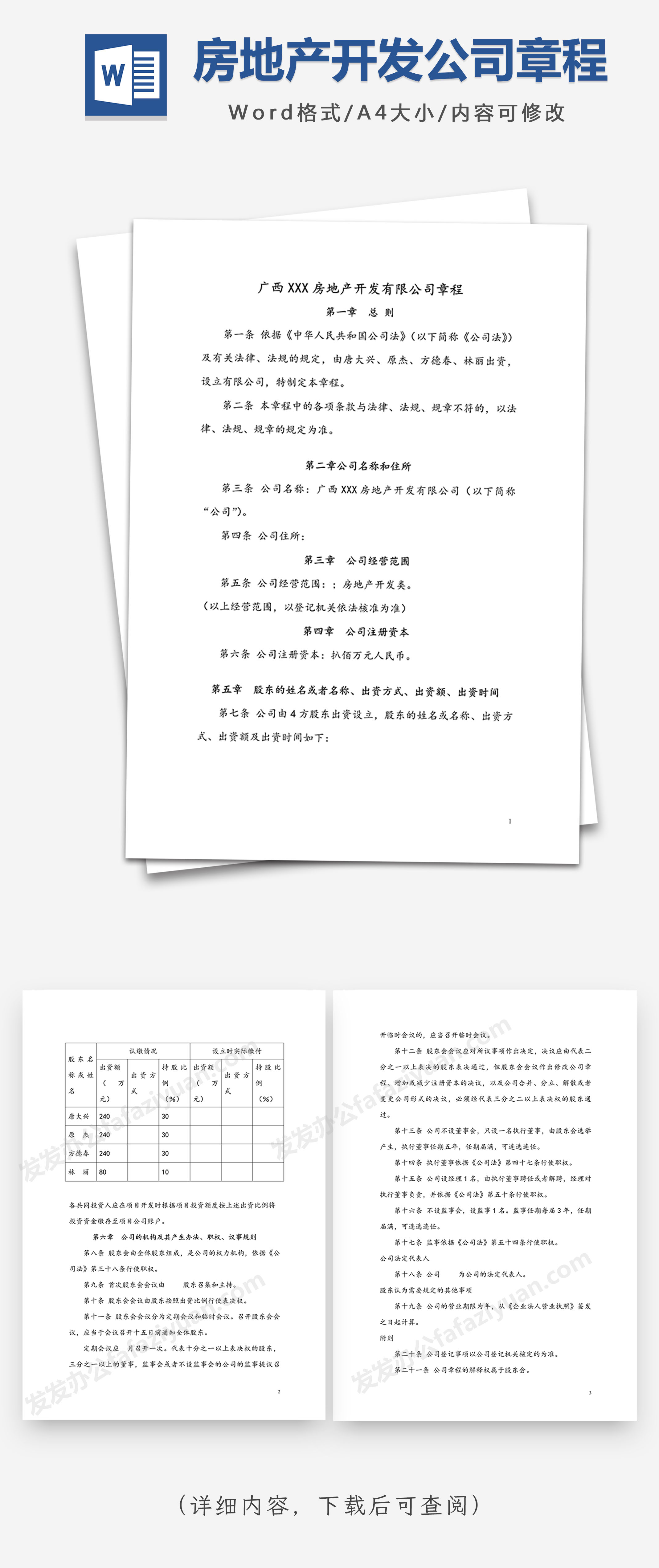 本作品内容为房地产开发有限公司章程Word模板, 格式为 docx, 大小1MB, 页数为5, 请使用软件Word打开, 作品中主体文字及图片可替换修改,文字修改可直接点击文本框进行编辑,图片更改可选中图片后单击鼠标右键选择更换图片,也可根据自身需求增加和删除作品中的内容, 源文件无水印, 欢迎使用发发资源库。
