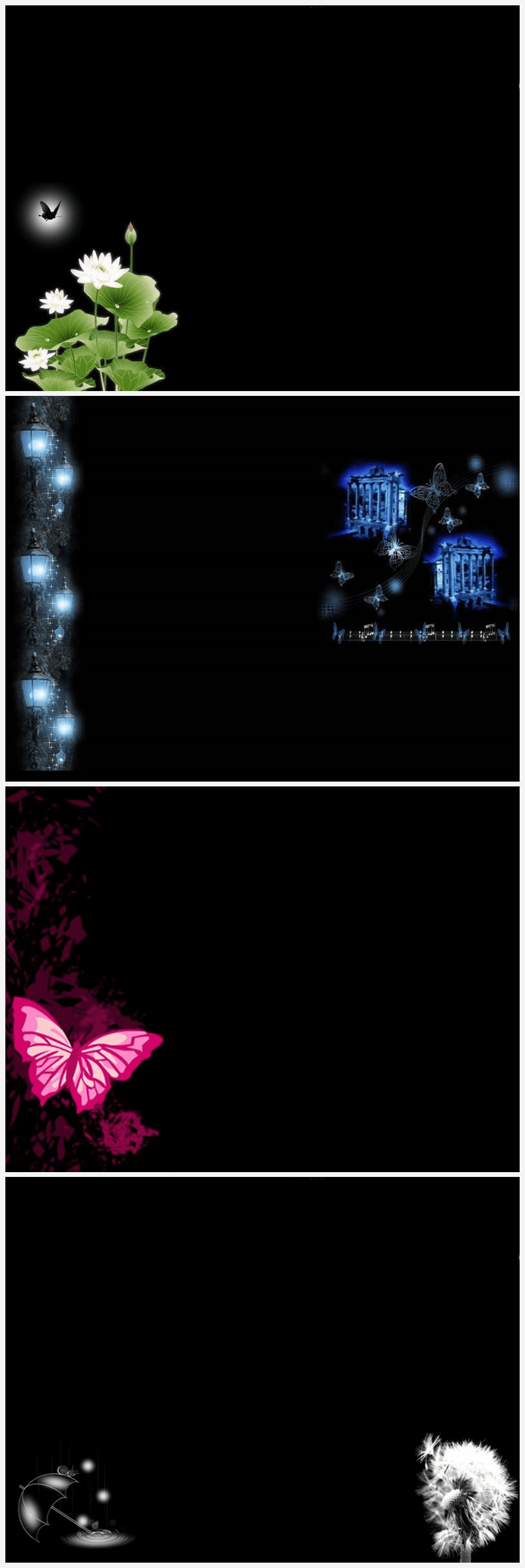 作品内容为黑色动态梦幻蝴蝶PPT背景图片下载, 格式为pptx, 大小0.17MB,页数4,背景图片4张,图片格式jpg, 请使用软件PowerPoint打开,作品中背景图片无需修改, 源文件无水印,可以直接使用, 欢迎使用发发资源库。