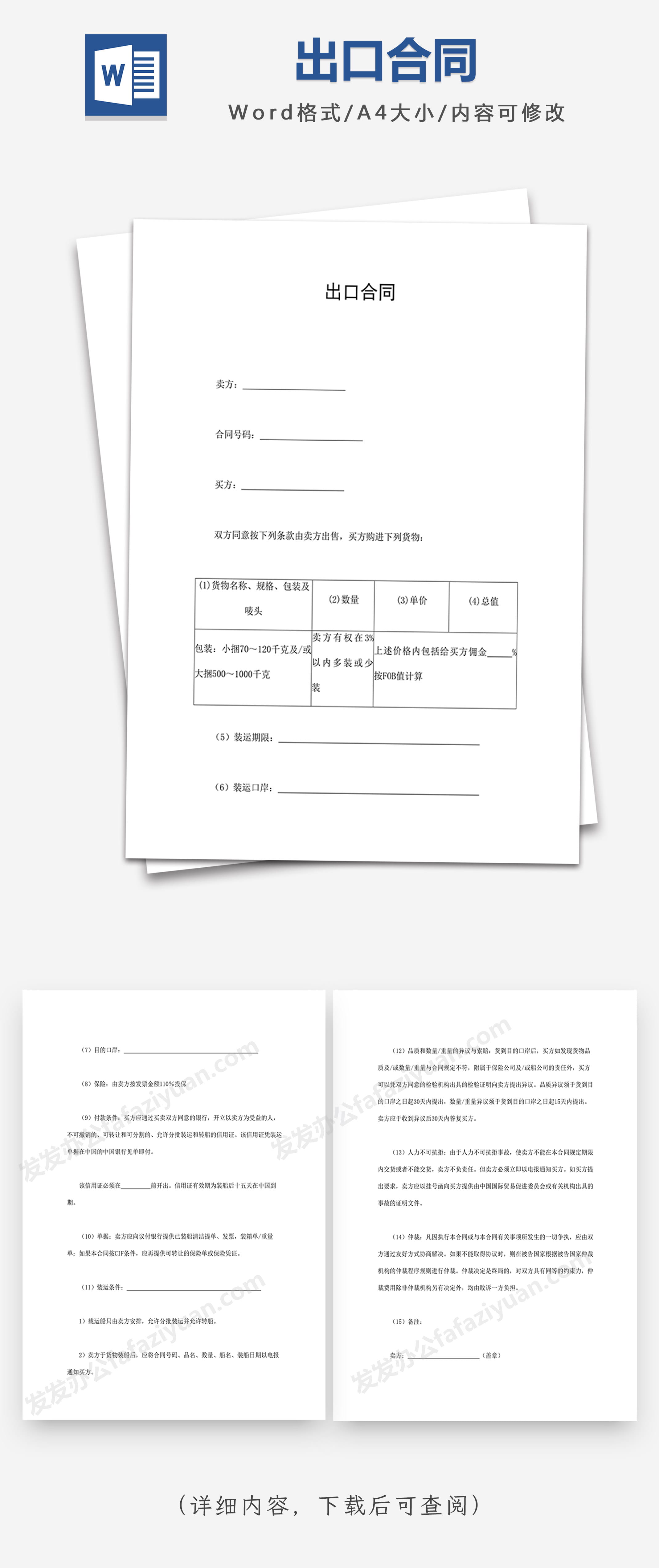 本作品内容为出口合同Word模板, 格式为 docx, 大小1 MB, 页数为4, 请使用软件Word打开, 作品中主体文字及图片可替换修改,文字修改可直接点击文本框进行编辑,图片更改可选中图片后单击鼠标右键选择更换图片,也可根据自身需求增加和删除作品中的内容, 源文件无水印, 欢迎使用发发资源库。