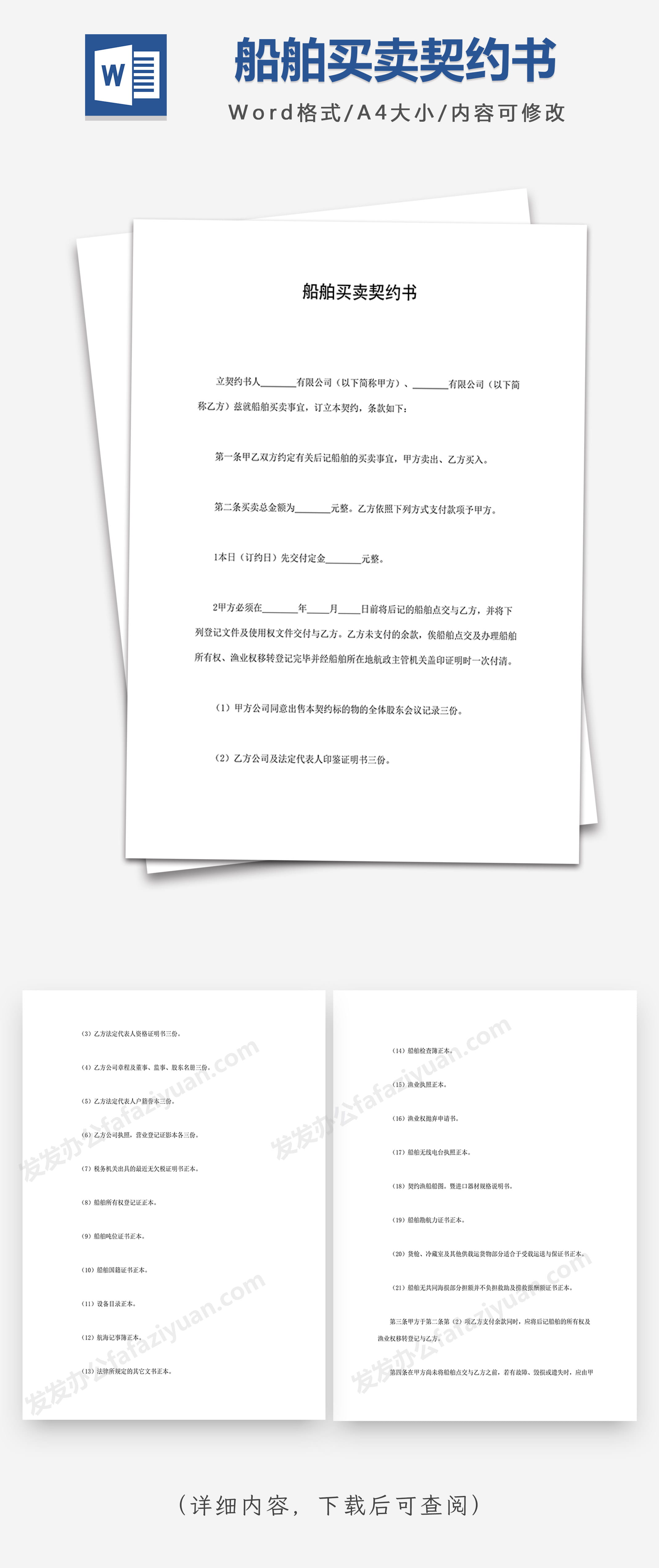本作品内容为船舶买卖契约书Word合同模板, 格式为 docx, 大小1 MB, 页数为8, 请使用软件Word打开, 作品中主体文字及图片可替换修改,文字修改可直接点击文本框进行编辑,图片更改可选中图片后单击鼠标右键选择更换图片,也可根据自身需求增加和删除作品中的内容, 源文件无水印, 欢迎使用发发资源库。 资源下载此资源下载价格为8.8F币,VIP免费,请先登录