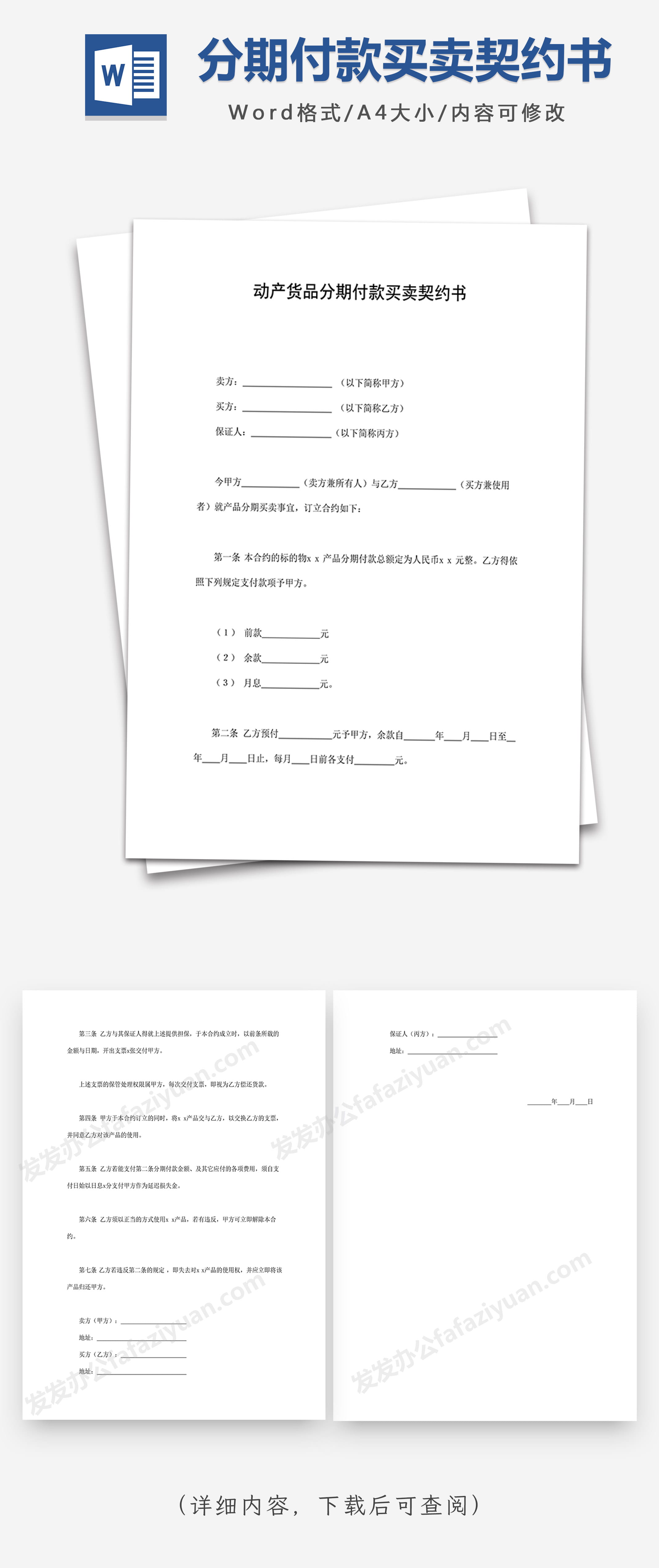 本作品内容为动产货品分期付款买卖契约书Word合同模板, 格式为 docx, 大小1 MB, 页数为3, 请使用软件Word打开, 作品中主体文字及图片可替换修改,文字修改可直接点击文本框进行编辑,图片更改可选中图片后单击鼠标右键选择更换图片,也可根据自身需求增加和删除作品中的内容, 源文件无水印, 欢迎使用发发资源库。 资源下载此资源下载价格为8.8F币,VIP免费,请先登录