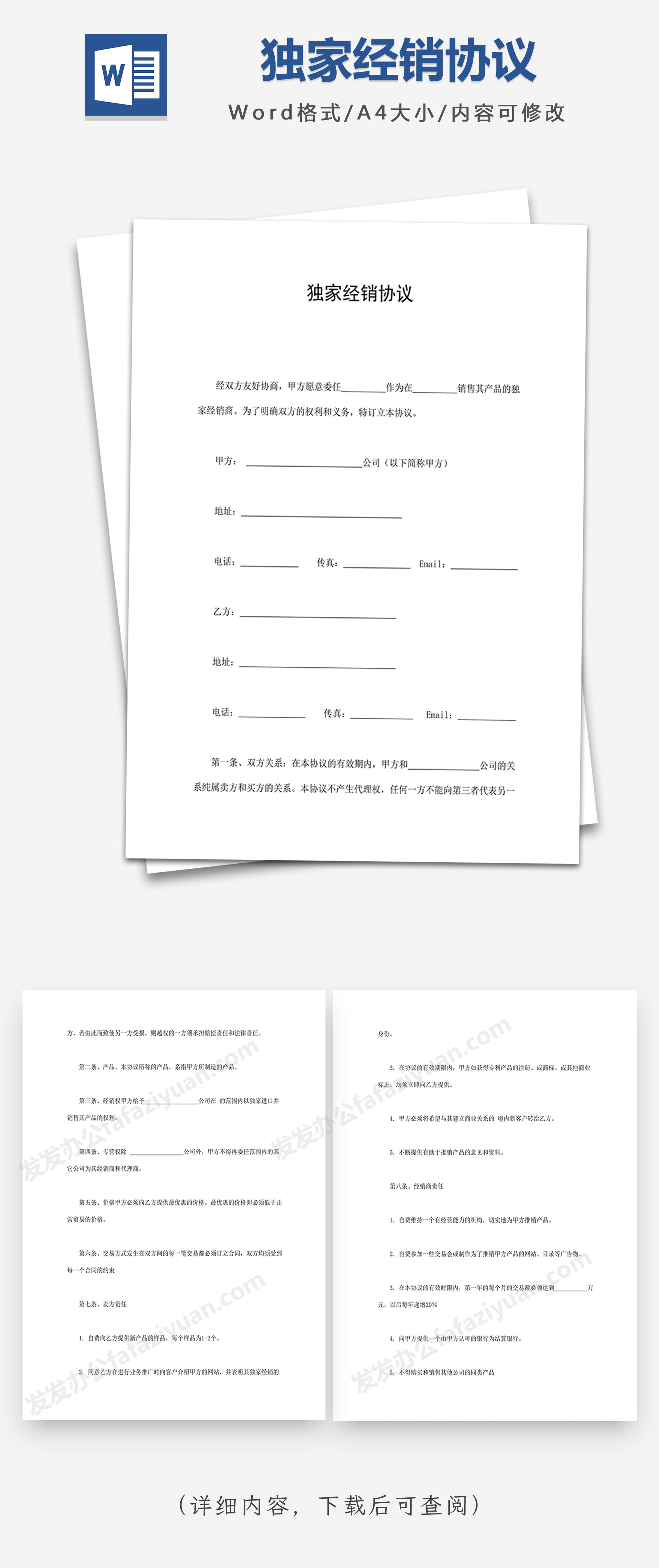 本作品内容为独家经销协议Word合同模板, 格式为 docx, 大小1 MB, 页数为5, 请使用软件Word打开, 作品中主体文字及图片可替换修改,文字修改可直接点击文本框进行编辑,图片更改可选中图片后单击鼠标右键选择更换图片,也可根据自身需求增加和删除作品中的内容, 源文件无水印, 欢迎使用发发资源库。