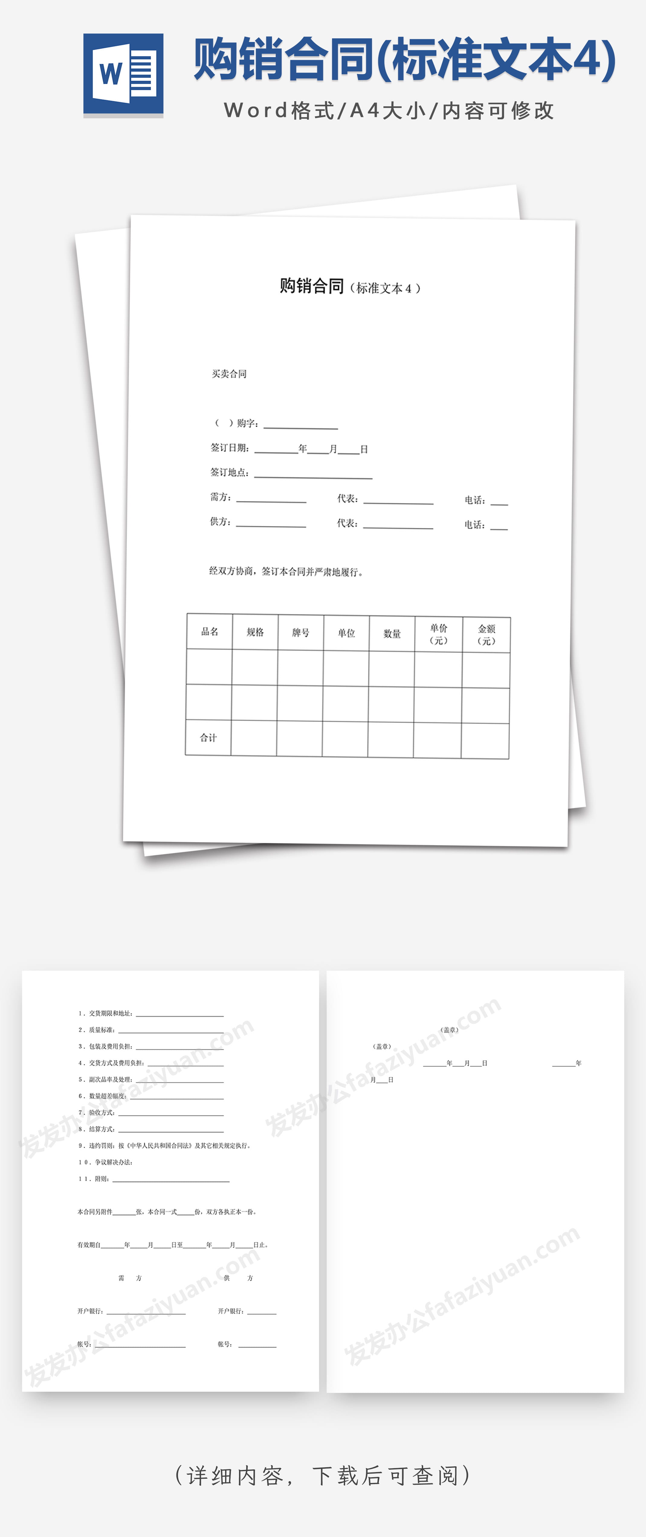 本作品内容为购销合同(标准文本4)Word合同模板, 格式为 docx, 大小1 MB, 页数为3, 请使用软件Word打开, 作品中主体文字及图片可替换修改,文字修改可直接点击文本框进行编辑,图片更改可选中图片后单击鼠标右键选择更换图片,也可根据自身需求增加和删除作品中的内容, 源文件无水印, 欢迎使用发发资源库。 资源下载此资源下载价格为8.8F币,VIP免费,请先登录