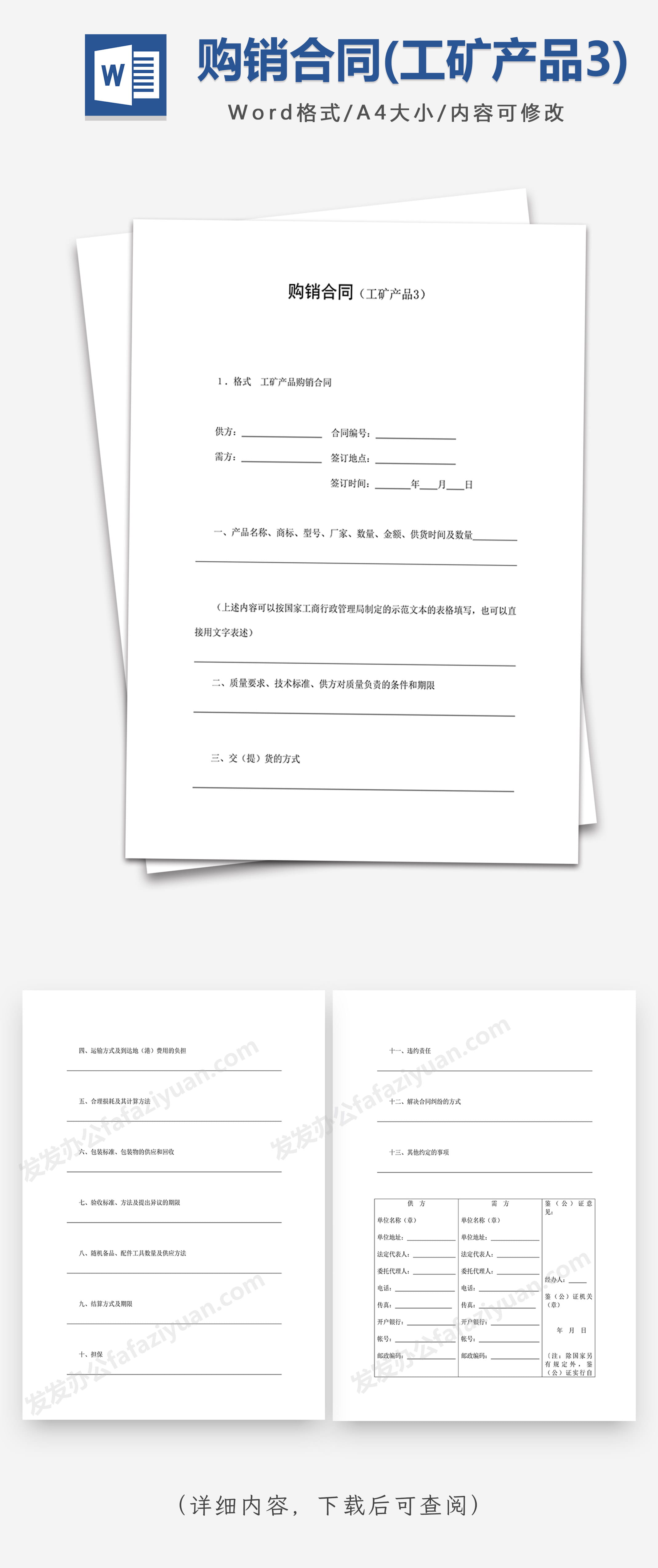 本作品内容为购销合同(工矿产品3)Word合同模板, 格式为 docx, 大小1 MB, 页数为5, 请使用软件Word打开, 作品中主体文字及图片可替换修改,文字修改可直接点击文本框进行编辑,图片更改可选中图片后单击鼠标右键选择更换图片,也可根据自身需求增加和删除作品中的内容, 源文件无水印, 欢迎使用发发资源库。