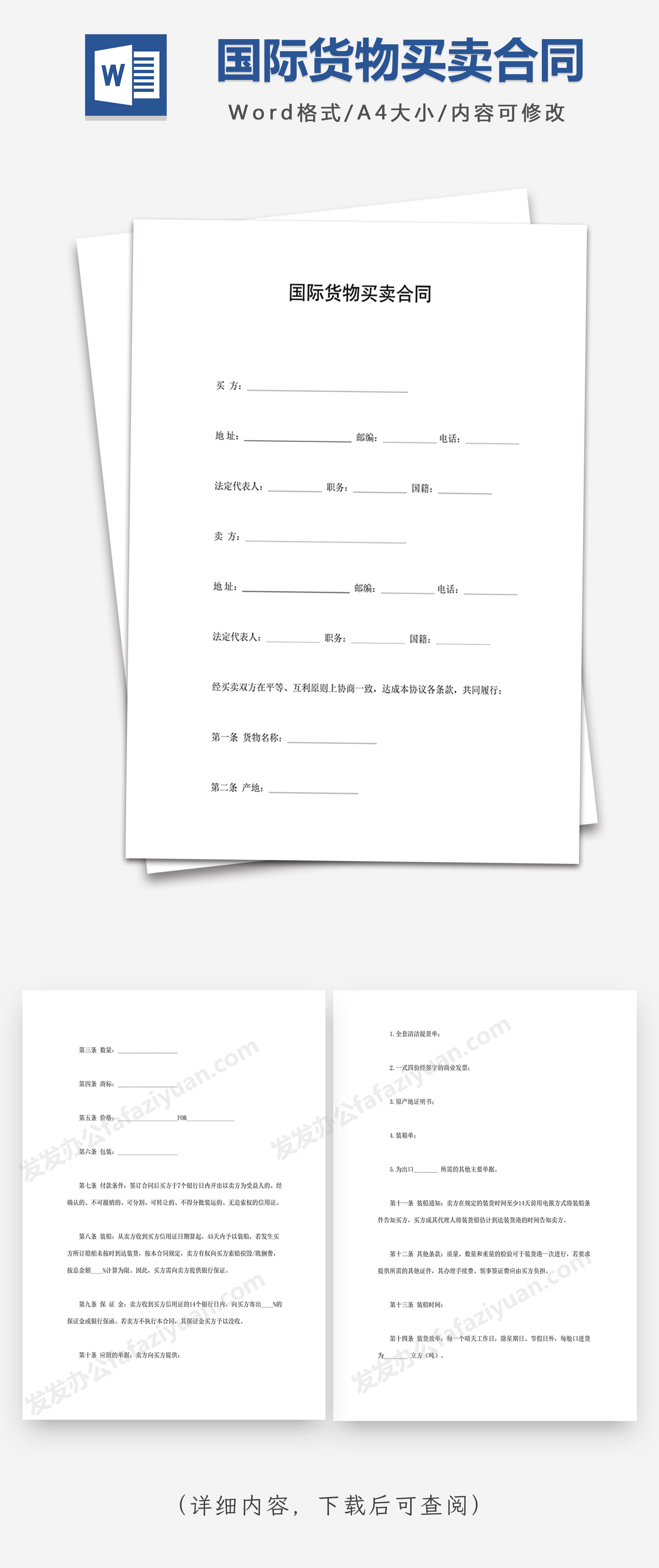 本作品内容为国际货物买卖合同Word合同模板, 格式为 docx, 大小1 MB, 页数为4, 请使用软件Word打开, 作品中主体文字及图片可替换修改,文字修改可直接点击文本框进行编辑,图片更改可选中图片后单击鼠标右键选择更换图片,也可根据自身需求增加和删除作品中的内容, 源文件无水印, 欢迎使用发发资源库。 资源下载此资源下载价格为8.8F币,VIP免费,请先登录