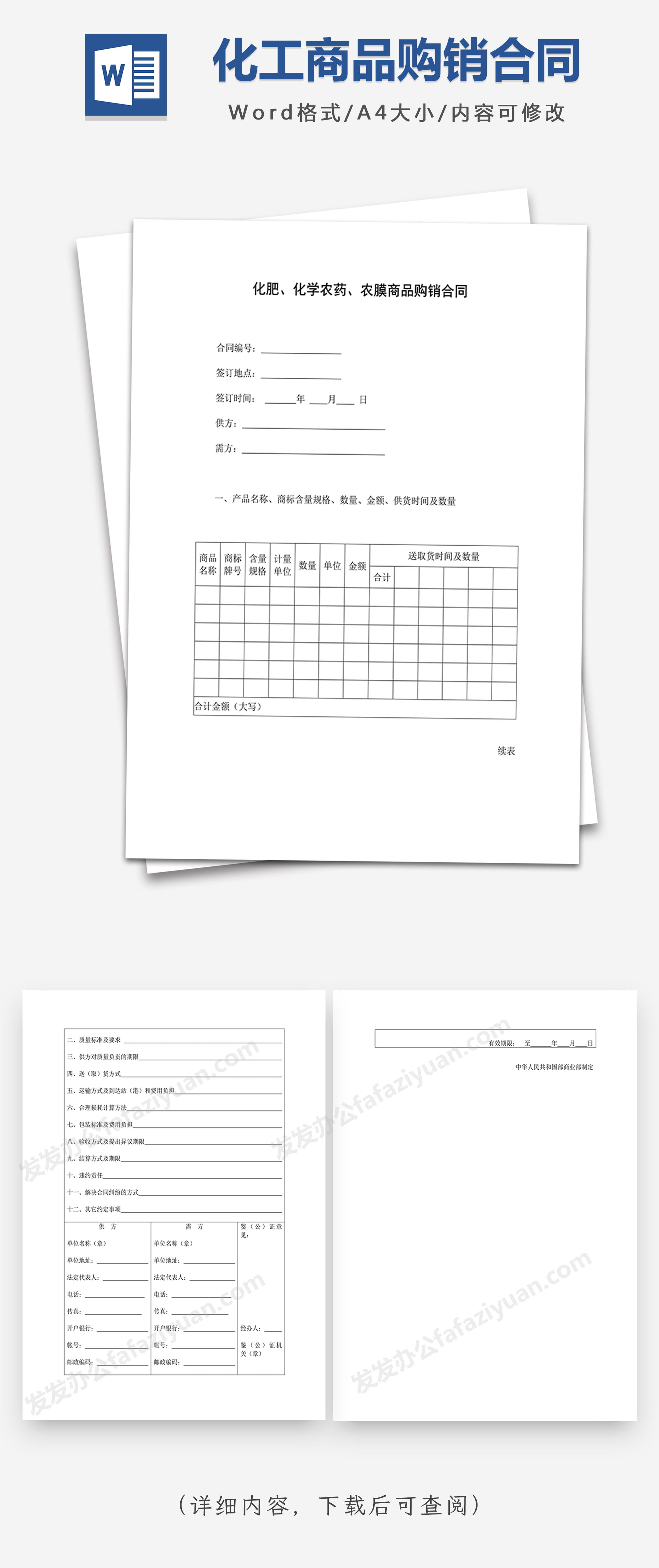 本作品内容为化肥、化学农药、农膜商品购销合同Word合同模板, 格式为 docx, 大小1 MB, 页数为3, 请使用软件Word打开, 作品中主体文字及图片可替换修改,文字修改可直接点击文本框进行编辑,图片更改可选中图片后单击鼠标右键选择更换图片,也可根据自身需求增加和删除作品中的内容, 源文件无水印, 欢迎使用发发资源库。