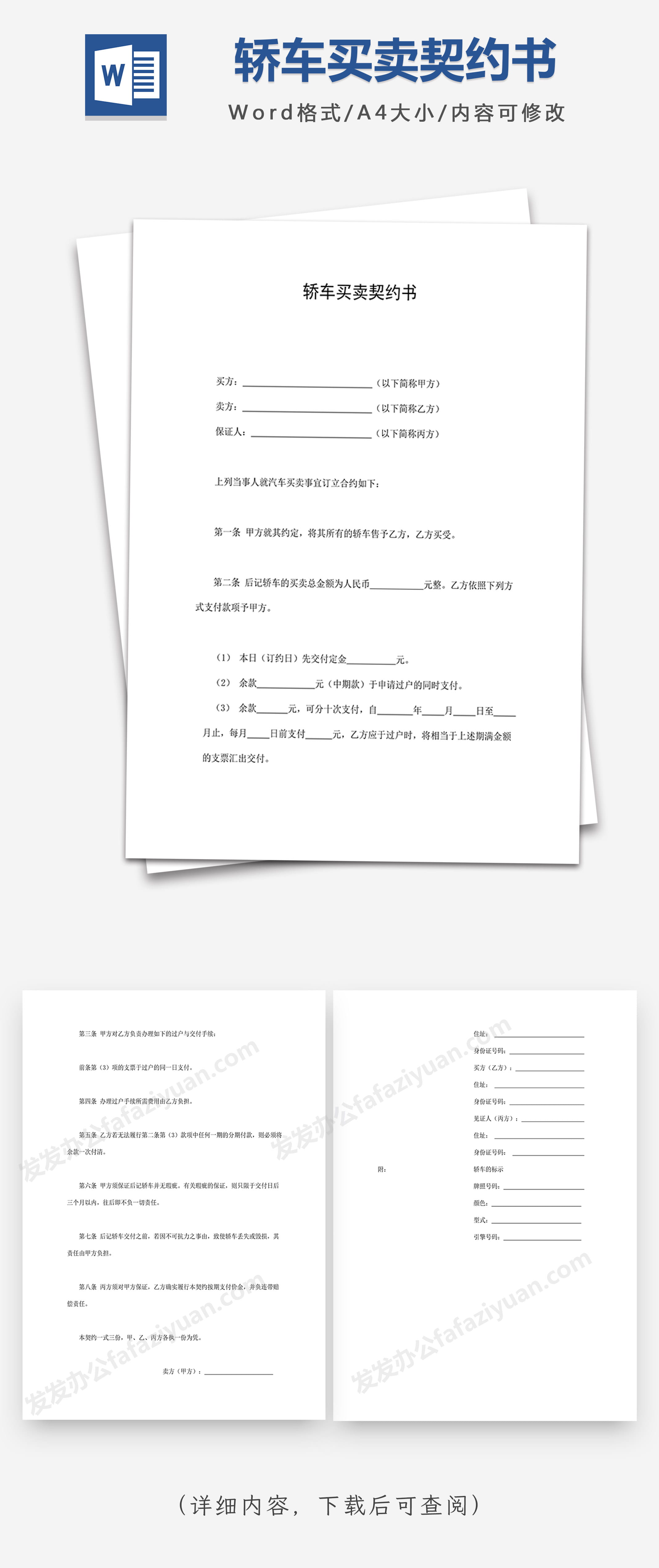 本作品内容为轿车买卖契约书Word合同模板, 格式为 docx, 大小1 MB, 页数为3, 请使用软件Word打开, 作品中主体文字及图片可替换修改,文字修改可直接点击文本框进行编辑,图片更改可选中图片后单击鼠标右键选择更换图片,也可根据自身需求增加和删除作品中的内容, 源文件无水印, 欢迎使用发发资源库。
