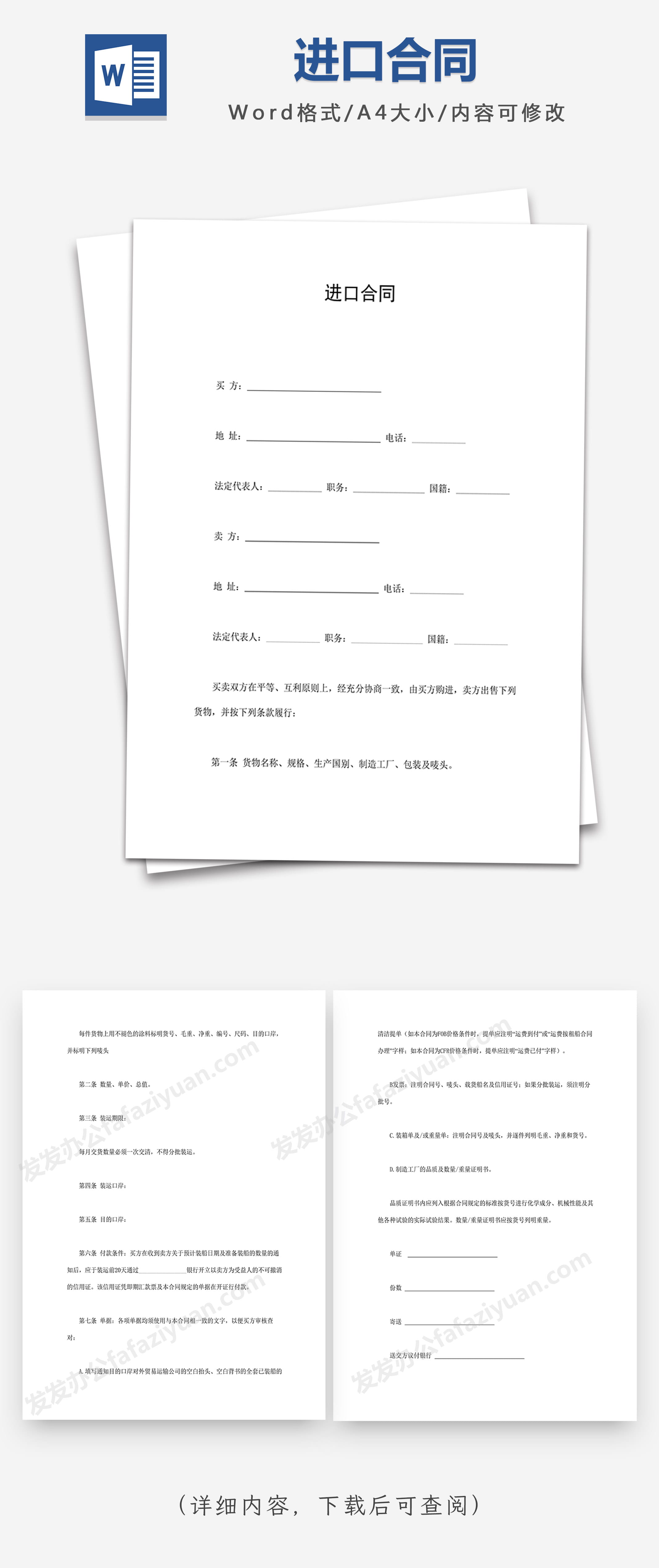 本作品内容为进口合同Word合同模板, 格式为 docx, 大小1 MB, 页数为7, 请使用软件Word打开, 作品中主体文字及图片可替换修改,文字修改可直接点击文本框进行编辑,图片更改可选中图片后单击鼠标右键选择更换图片,也可根据自身需求增加和删除作品中的内容, 源文件无水印, 欢迎使用发发资源库。 资源下载此资源下载价格为8.8F币,VIP免费,请先登录