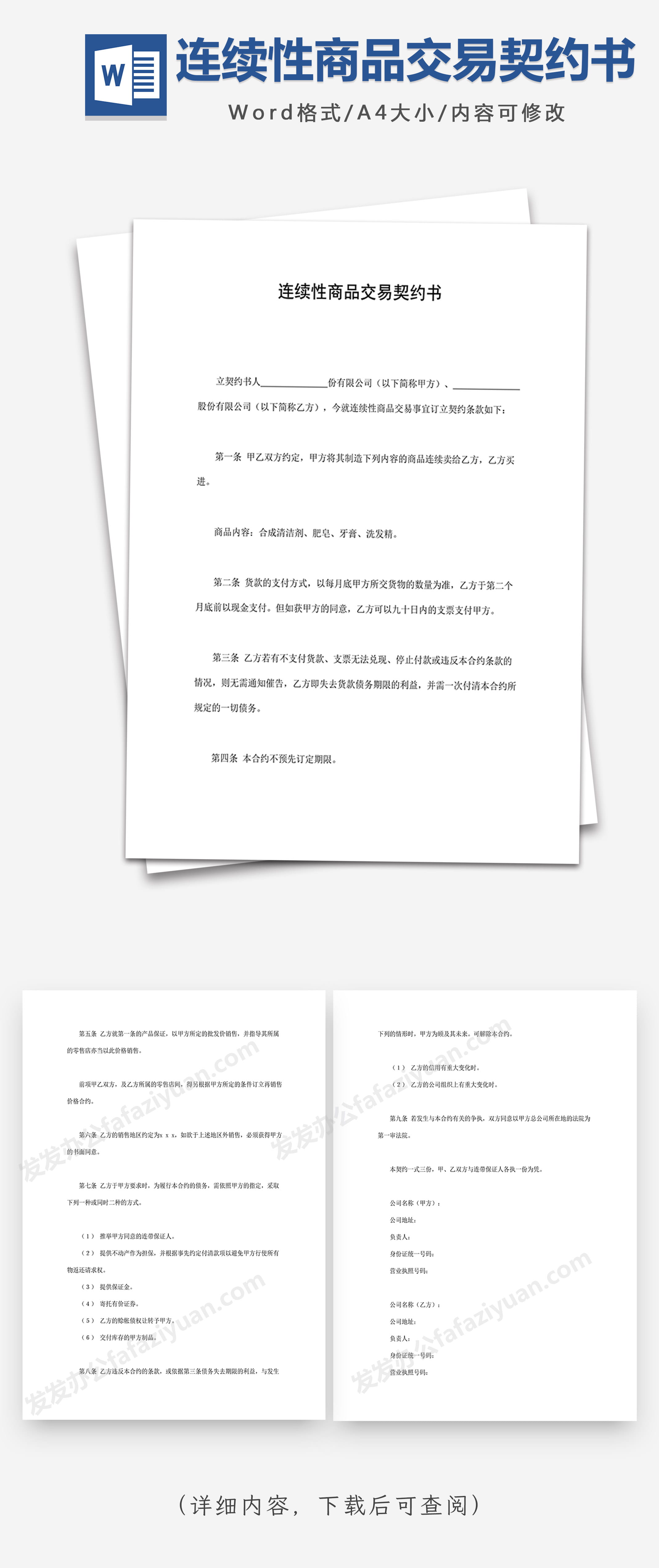 本作品内容为连续性商品交易契约书Word合同模板, 格式为 docx, 大小1 MB, 页数为4, 请使用软件Word打开, 作品中主体文字及图片可替换修改,文字修改可直接点击文本框进行编辑,图片更改可选中图片后单击鼠标右键选择更换图片,也可根据自身需求增加和删除作品中的内容, 源文件无水印, 欢迎使用发发资源库。 资源下载此资源下载价格为8.8F币,VIP免费,请先登录