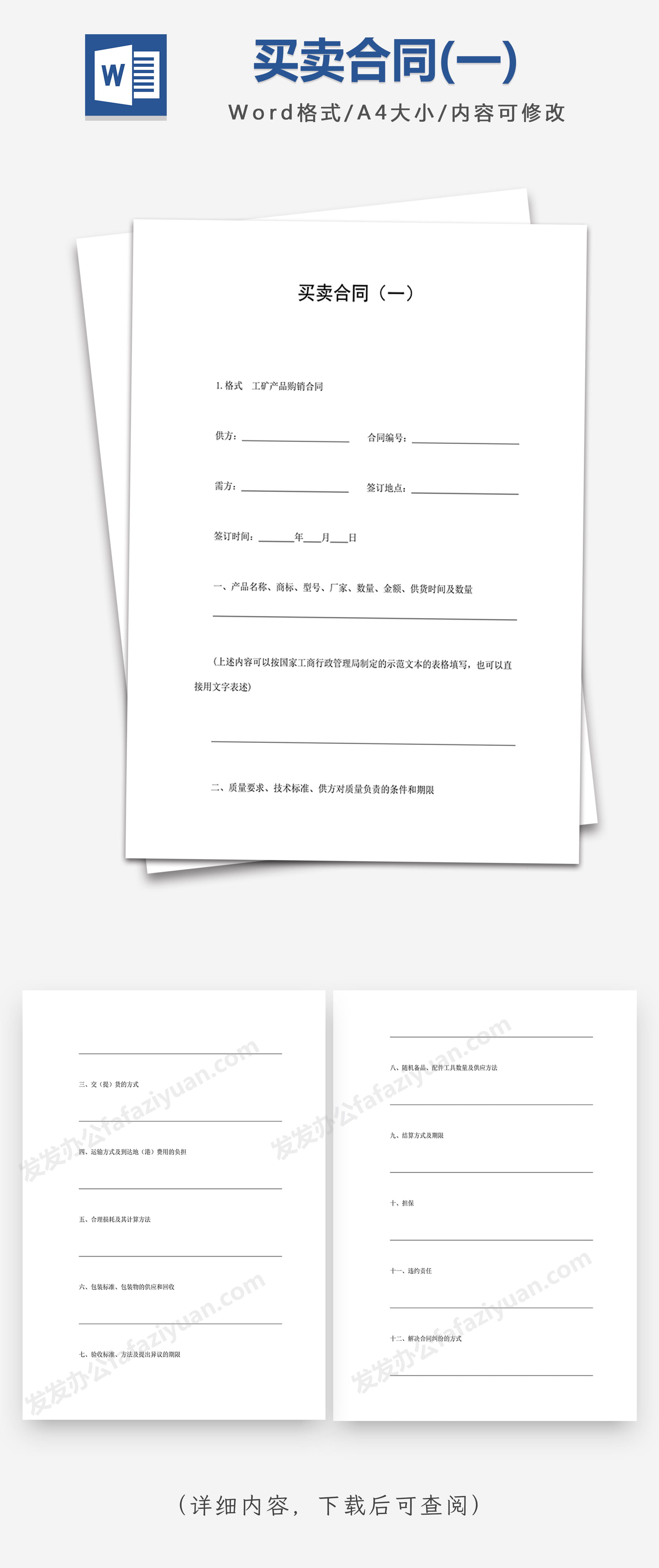 本作品内容为买卖合同(一)Word合同模板, 格式为 docx, 大小1 MB, 页数为6, 请使用软件Word打开, 作品中主体文字及图片可替换修改,文字修改可直接点击文本框进行编辑,图片更改可选中图片后单击鼠标右键选择更换图片,也可根据自身需求增加和删除作品中的内容, 源文件无水印, 欢迎使用发发资源库。