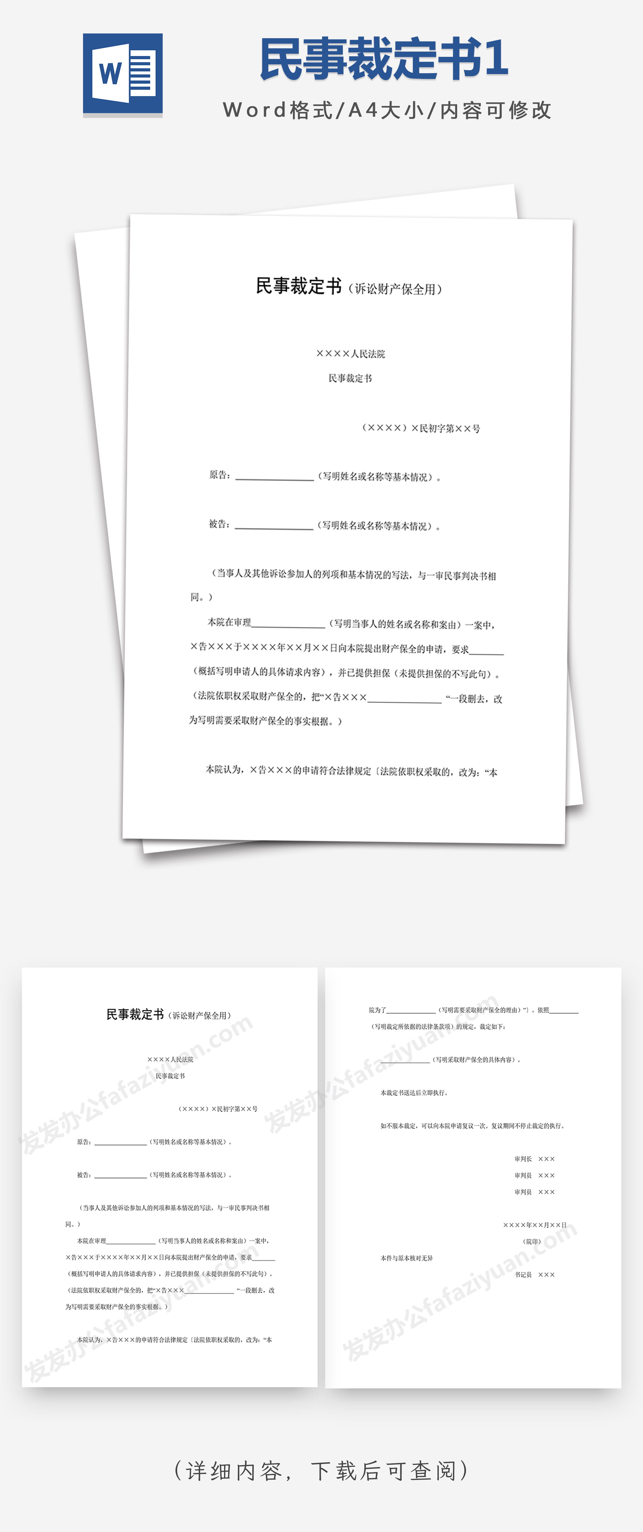 本作品内容为民事裁定书1Word合同模板, 格式为 docx, 大小1 MB, 页数为2, 请使用软件Word打开, 作品中主体文字及图片可替换修改,文字修改可直接点击文本框进行编辑,图片更改可选中图片后单击鼠标右键选择更换图片,也可根据自身需求增加和删除作品中的内容, 源文件无水印, 欢迎使用发发资源库。