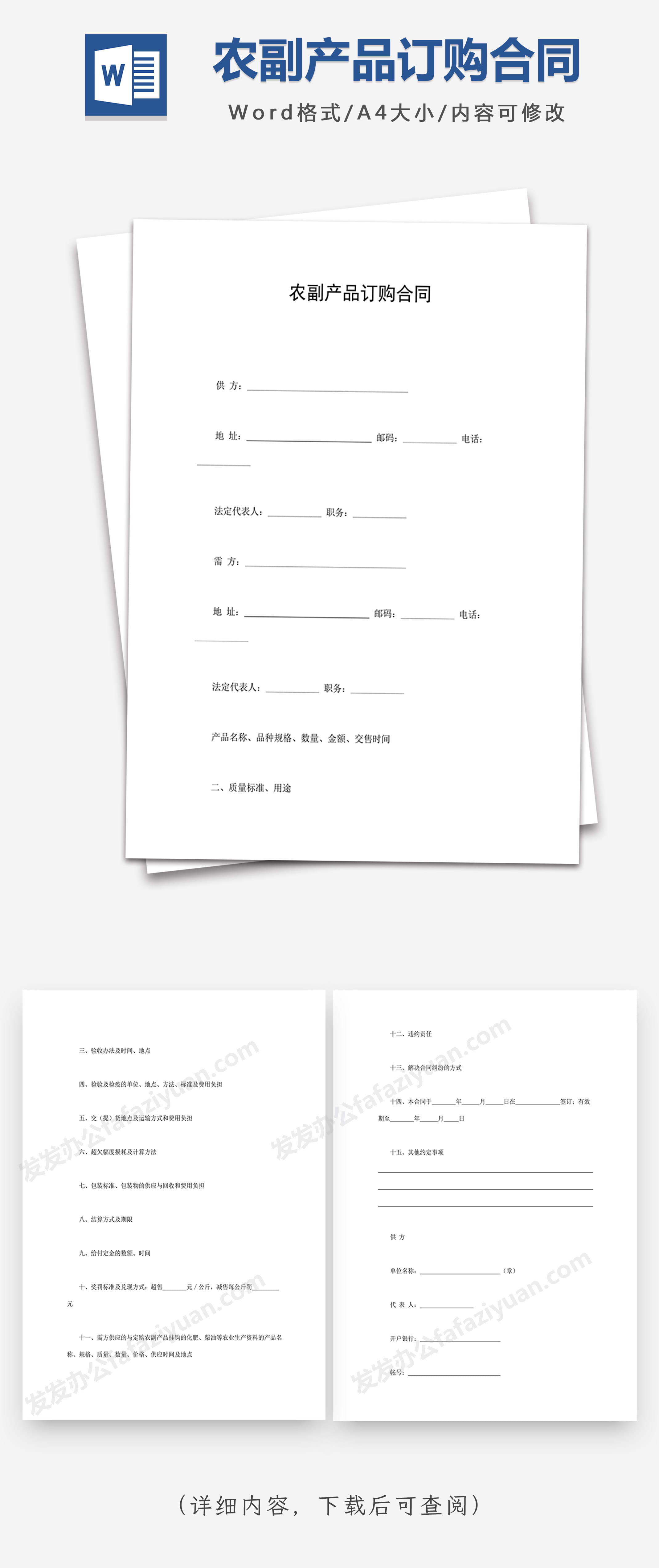 本作品内容为农副产品订购合同Word合同模板, 格式为 docx, 大小1 MB, 页数为4, 请使用软件Word打开, 作品中主体文字及图片可替换修改,文字修改可直接点击文本框进行编辑,图片更改可选中图片后单击鼠标右键选择更换图片,也可根据自身需求增加和删除作品中的内容, 源文件无水印, 欢迎使用发发资源库。 资源下载此资源下载价格为8.8F币,VIP免费,请先登录