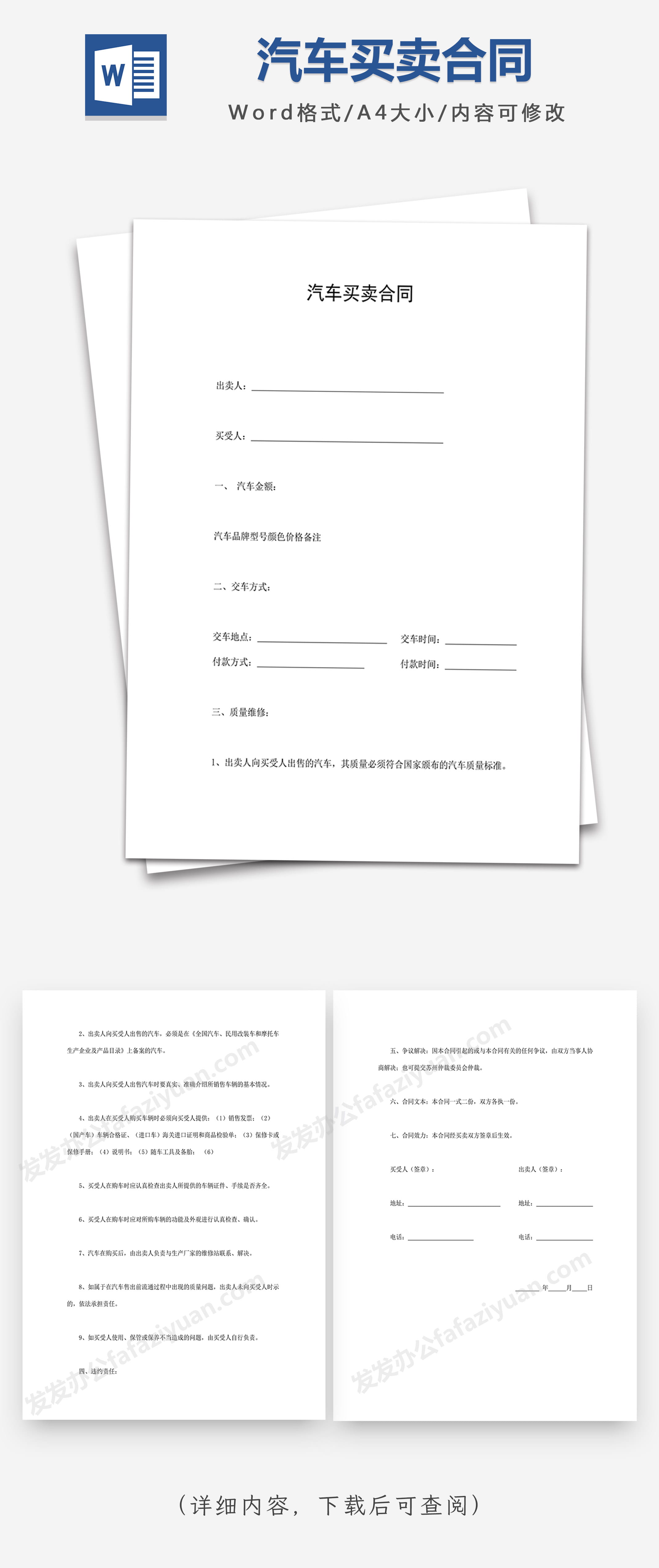 本作品内容为汽车买卖合同Word合同模板, 格式为 docx, 大小1 MB, 页数为3, 请使用软件Word打开, 作品中主体文字及图片可替换修改,文字修改可直接点击文本框进行编辑,图片更改可选中图片后单击鼠标右键选择更换图片,也可根据自身需求增加和删除作品中的内容, 源文件无水印, 欢迎使用发发资源库。 资源下载此资源下载价格为8.8F币,VIP免费,请先登录
