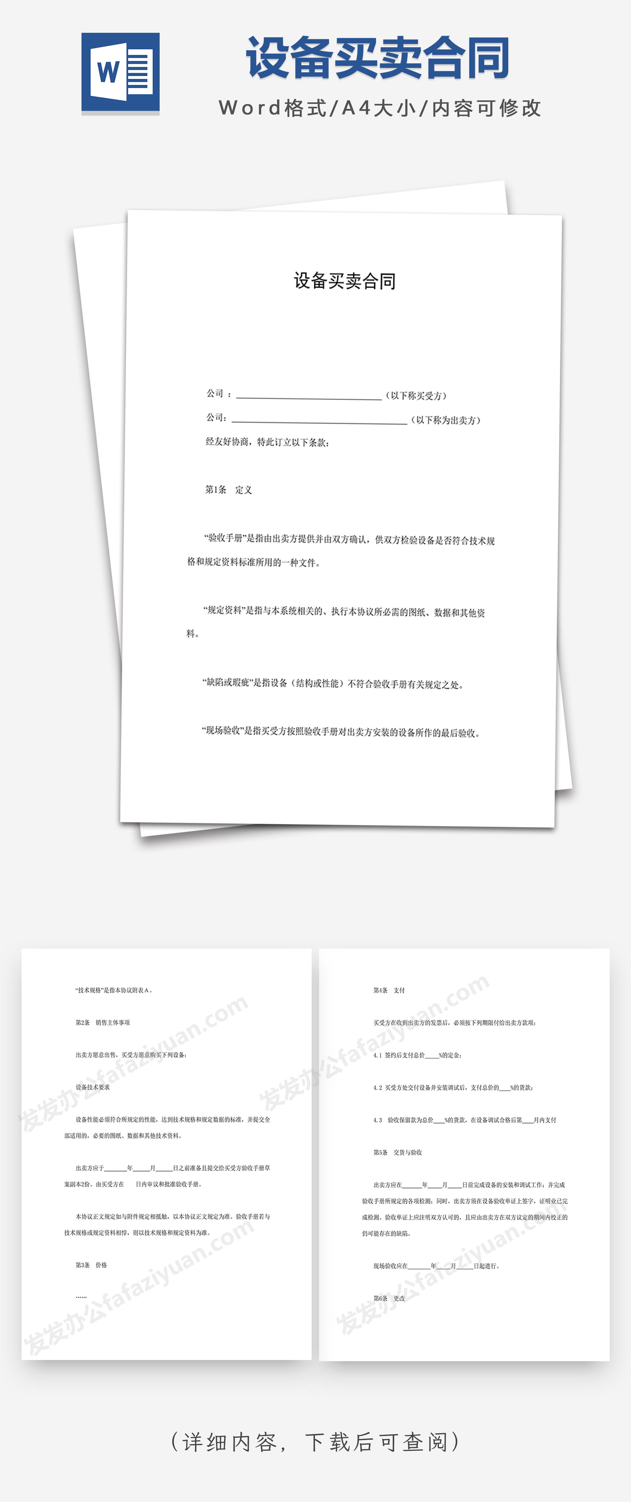 本作品内容为设备买卖合同Word合同模板, 格式为 docx, 大小1 MB, 页数为5, 请使用软件Word打开, 作品中主体文字及图片可替换修改,文字修改可直接点击文本框进行编辑,图片更改可选中图片后单击鼠标右键选择更换图片,也可根据自身需求增加和删除作品中的内容, 源文件无水印, 欢迎使用发发资源库。