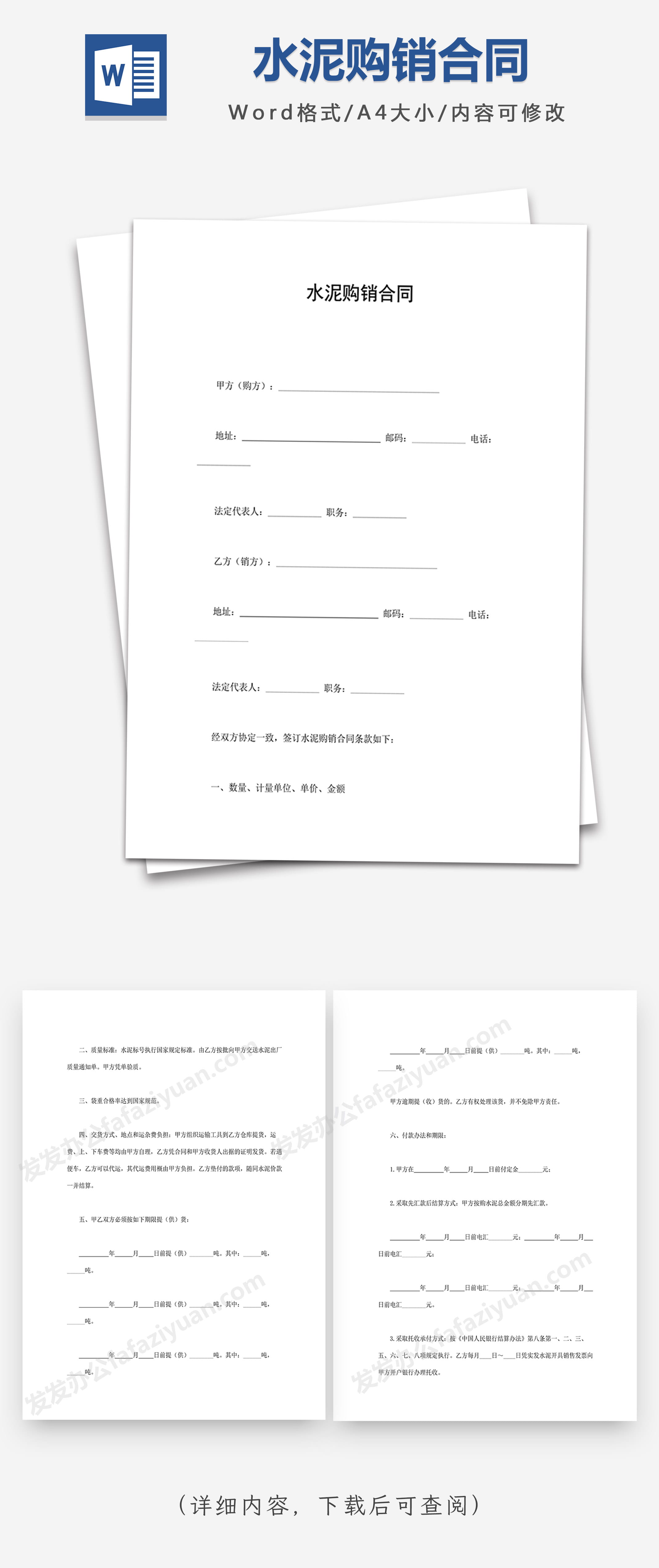 本作品内容为水泥购销合同Word合同模板, 格式为 docx, 大小1 MB, 页数为5, 请使用软件Word打开, 作品中主体文字及图片可替换修改,文字修改可直接点击文本框进行编辑,图片更改可选中图片后单击鼠标右键选择更换图片,也可根据自身需求增加和删除作品中的内容, 源文件无水印, 欢迎使用发发资源库。 资源下载此资源下载价格为8.8F币,VIP免费,请先登录