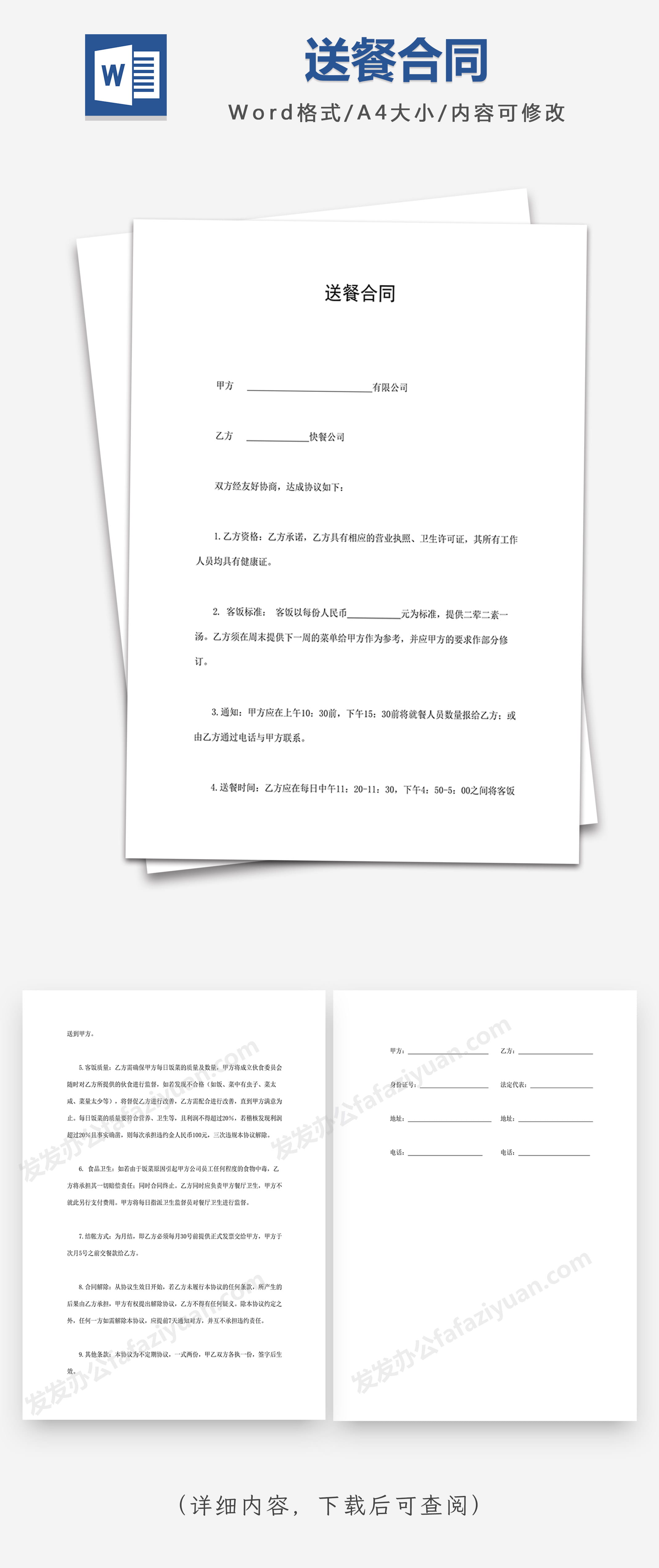 本作品内容为送餐合同Word合同模板, 格式为 docx, 大小1 MB, 页数为3, 请使用软件Word打开, 作品中主体文字及图片可替换修改,文字修改可直接点击文本框进行编辑,图片更改可选中图片后单击鼠标右键选择更换图片,也可根据自身需求增加和删除作品中的内容, 源文件无水印, 欢迎使用发发资源库。