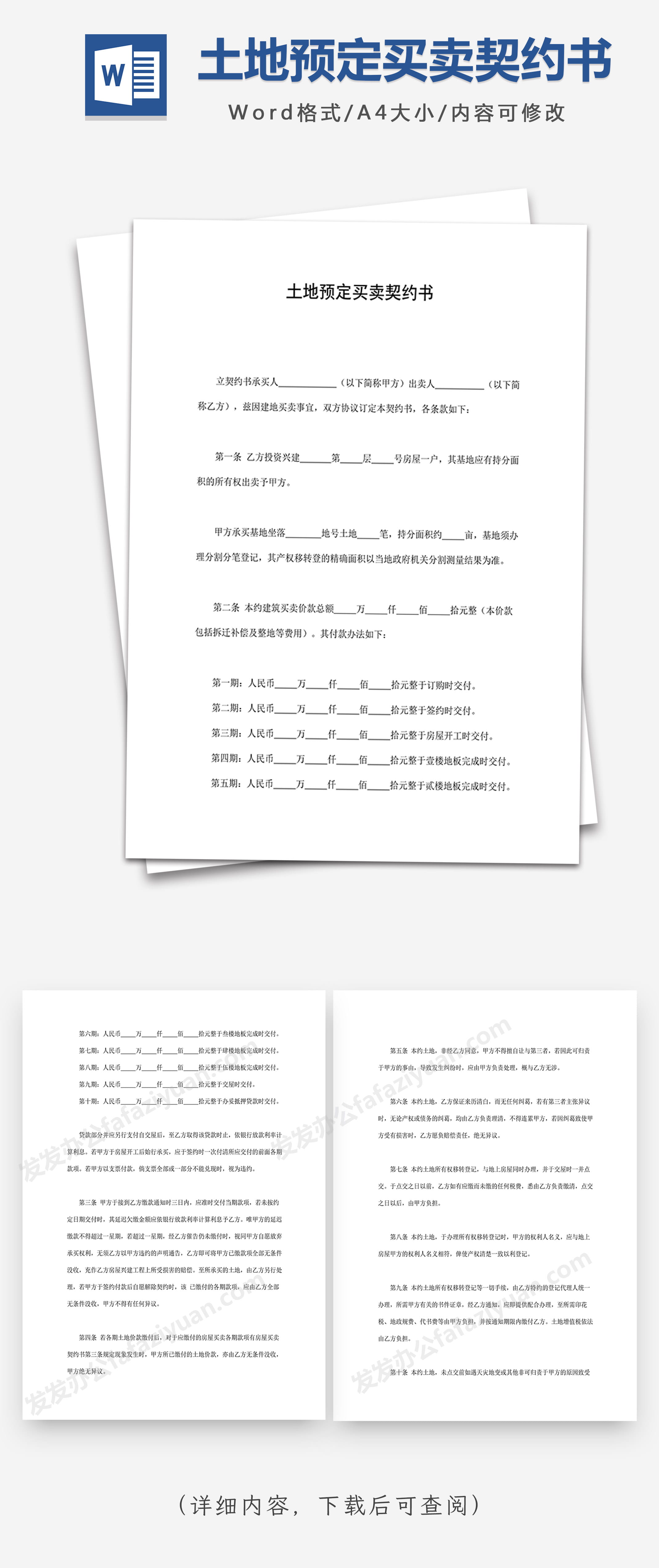 本作品内容为土地预定买卖契约书Word合同模板, 格式为 docx, 大小1 MB, 页数为4, 请使用软件Word打开, 作品中主体文字及图片可替换修改,文字修改可直接点击文本框进行编辑,图片更改可选中图片后单击鼠标右键选择更换图片,也可根据自身需求增加和删除作品中的内容, 源文件无水印, 欢迎使用发发资源库。