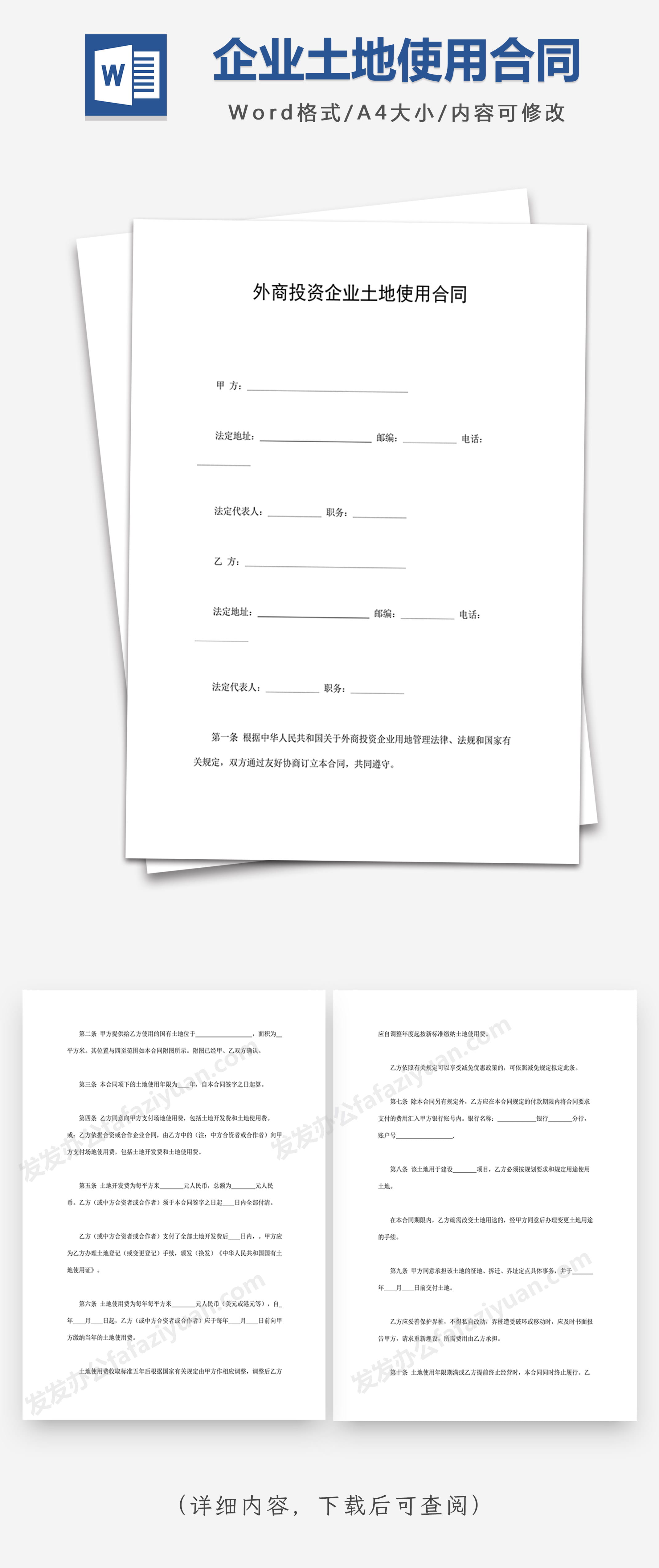 本作品内容为外商投资企业土地使用合同Word合同模板, 格式为 docx, 大小1 MB, 页数为6, 请使用软件Word打开, 作品中主体文字及图片可替换修改,文字修改可直接点击文本框进行编辑,图片更改可选中图片后单击鼠标右键选择更换图片,也可根据自身需求增加和删除作品中的内容, 源文件无水印, 欢迎使用发发资源库。 资源下载此资源下载价格为8.8F币,VIP免费,请先登录