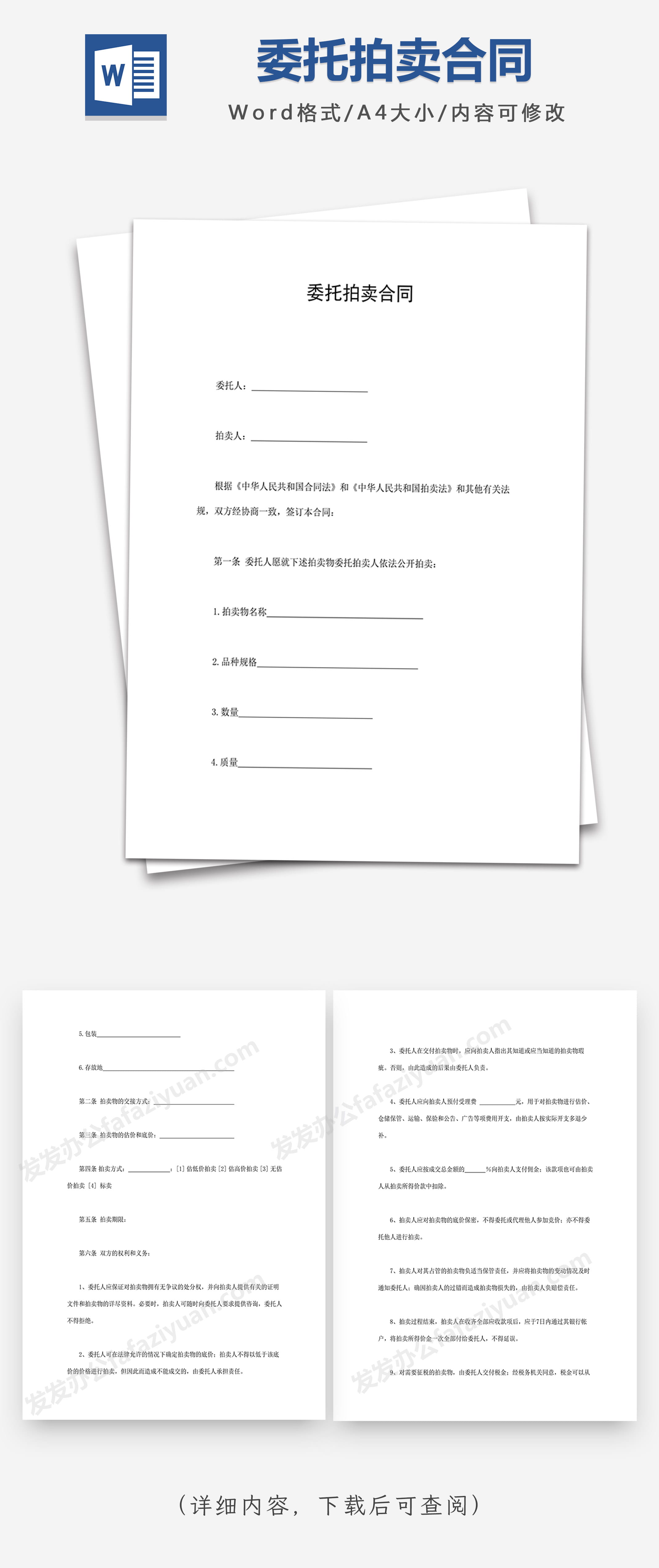 本作品内容为委托拍卖合同Word合同模板, 格式为 docx, 大小1 MB, 页数为6, 请使用软件Word打开, 作品中主体文字及图片可替换修改,文字修改可直接点击文本框进行编辑,图片更改可选中图片后单击鼠标右键选择更换图片,也可根据自身需求增加和删除作品中的内容, 源文件无水印, 欢迎使用发发资源库。