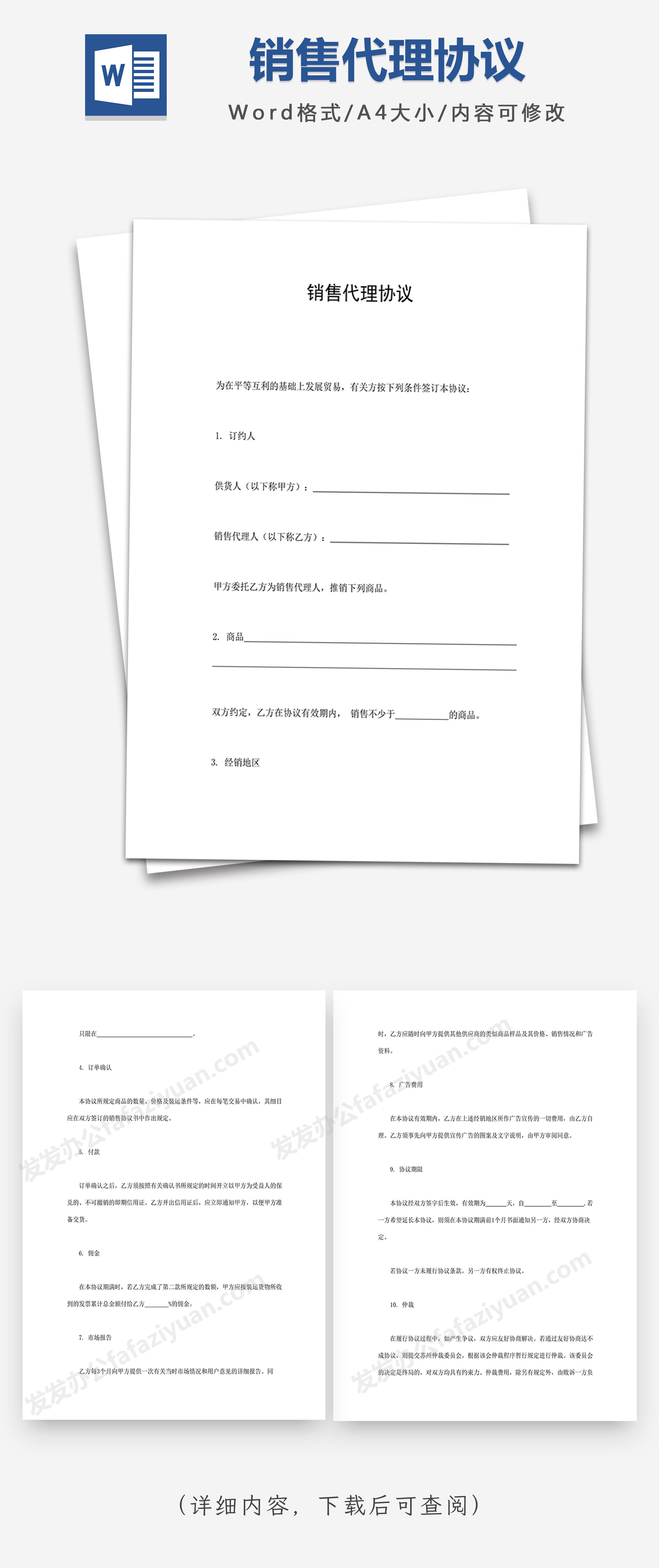 本作品内容为销售代理协议Word合同模板, 格式为 docx, 大小1 MB, 页数为4, 请使用软件Word打开, 作品中主体文字及图片可替换修改,文字修改可直接点击文本框进行编辑,图片更改可选中图片后单击鼠标右键选择更换图片,也可根据自身需求增加和删除作品中的内容, 源文件无水印, 欢迎使用发发资源库。 资源下载此资源下载价格为8.8F币,VIP免费,请先登录